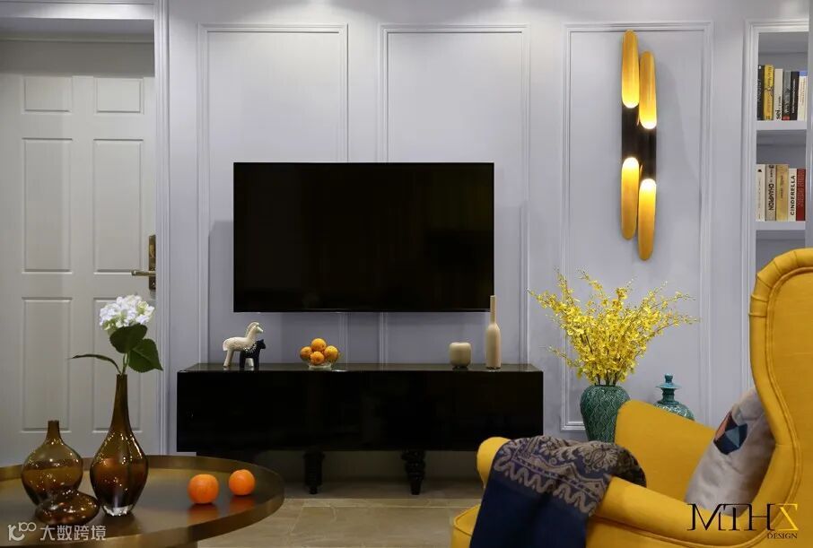 如果电视墙上有2个门洞的话,条件允许的时候可以把电视墙以两扇门为基础,在中间布置电视柜与电视机,实现一个实用与对称美学兼具的电视墙设计。这样不需要做什么特殊的处理就能保持电视墙的美观大方效果。