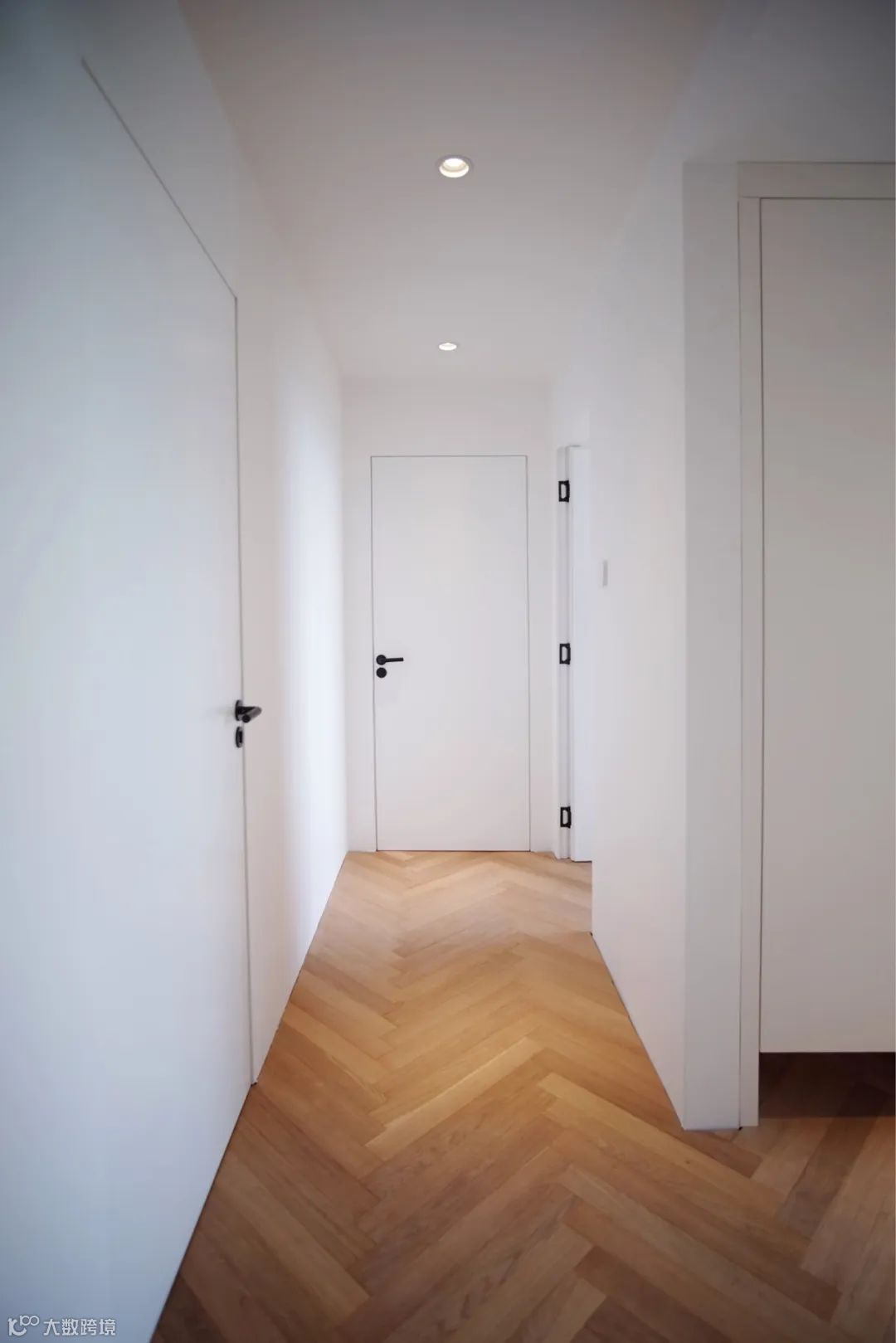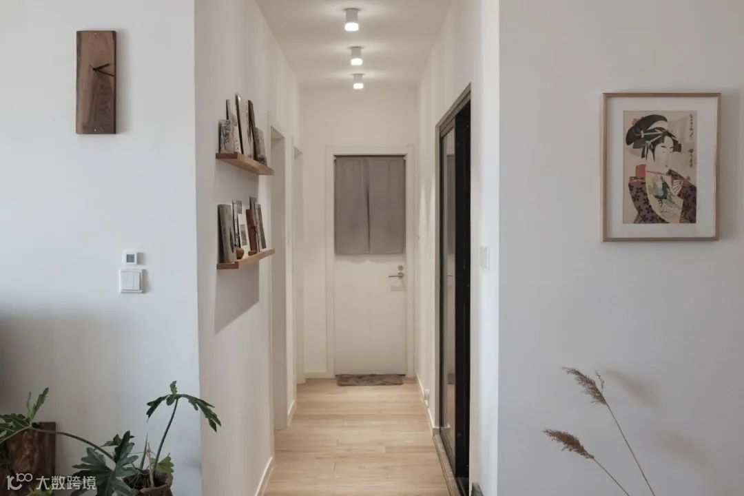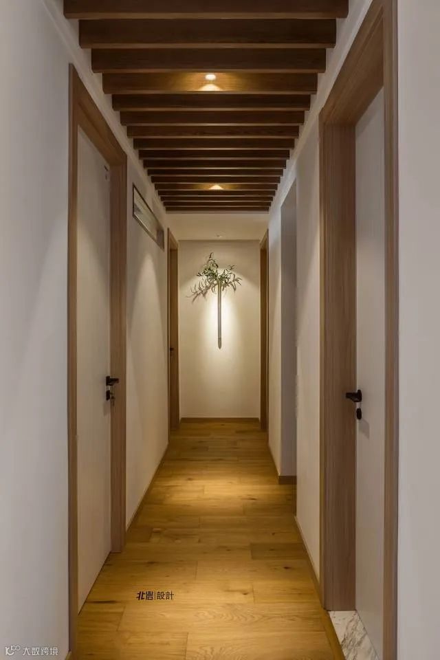 如果房子的层高比较高的话,也可以把整个走廊的天花都吊平,然后把筒灯装到天花里面,维持一个简洁平整的走廊空间,这样简单大方的设计,带来的空间感也是简约自然而又舒适。