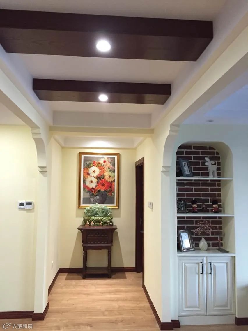 走廊的天花上有比较多的横梁,但是层高不适合吊平顶的情况,也可以考虑采用假梁吊顶的设计,把横梁用木饰面包装起来,然后再增加几个木色假梁设计,让空间的质感更加和谐自然。