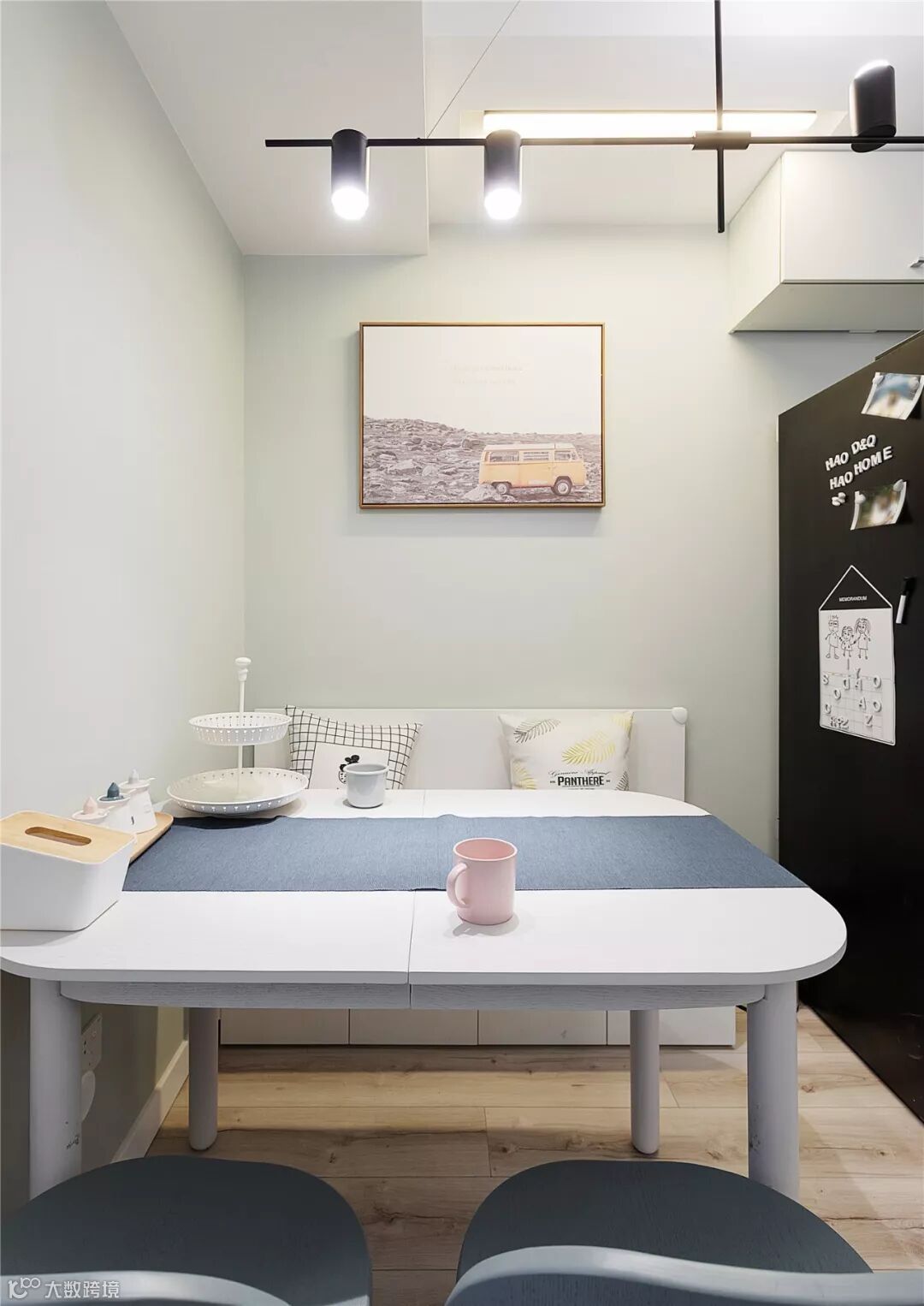 ▲ 与客厅相呼应的灰绿色墙面,加上马卡龙彩色的餐桌椅,北欧风的气息扑面而来。