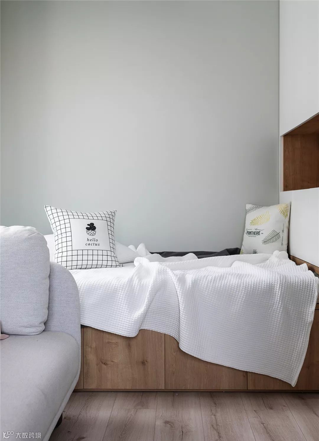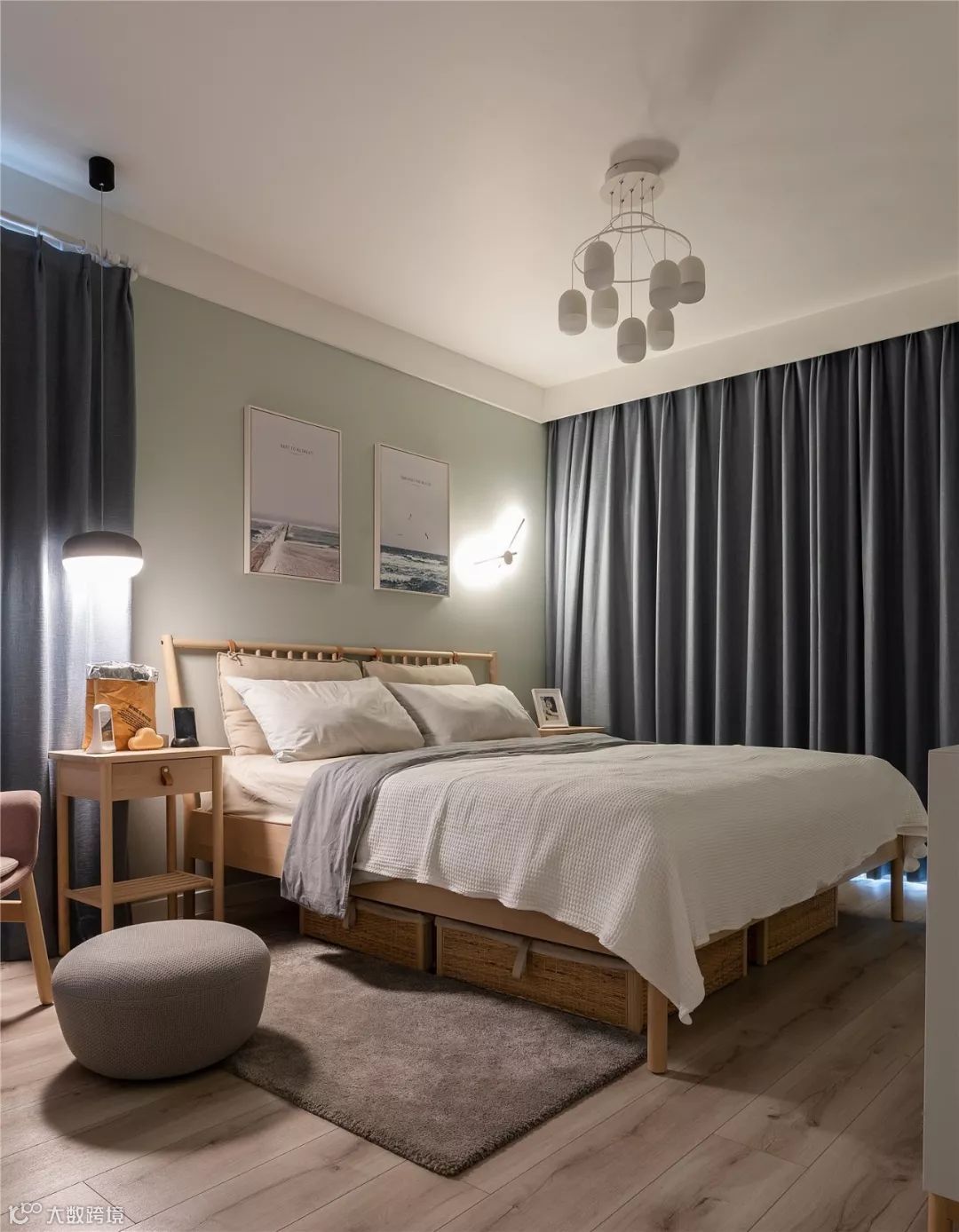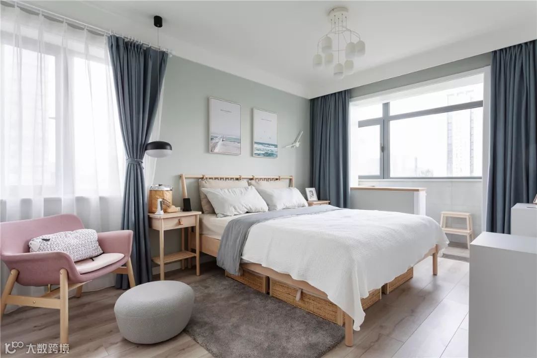 ▲ 主卧地面铺设木色地板,墙面为了整体搭配选用了与客厅同颜色的乳胶漆,整体清新又有文艺气息。