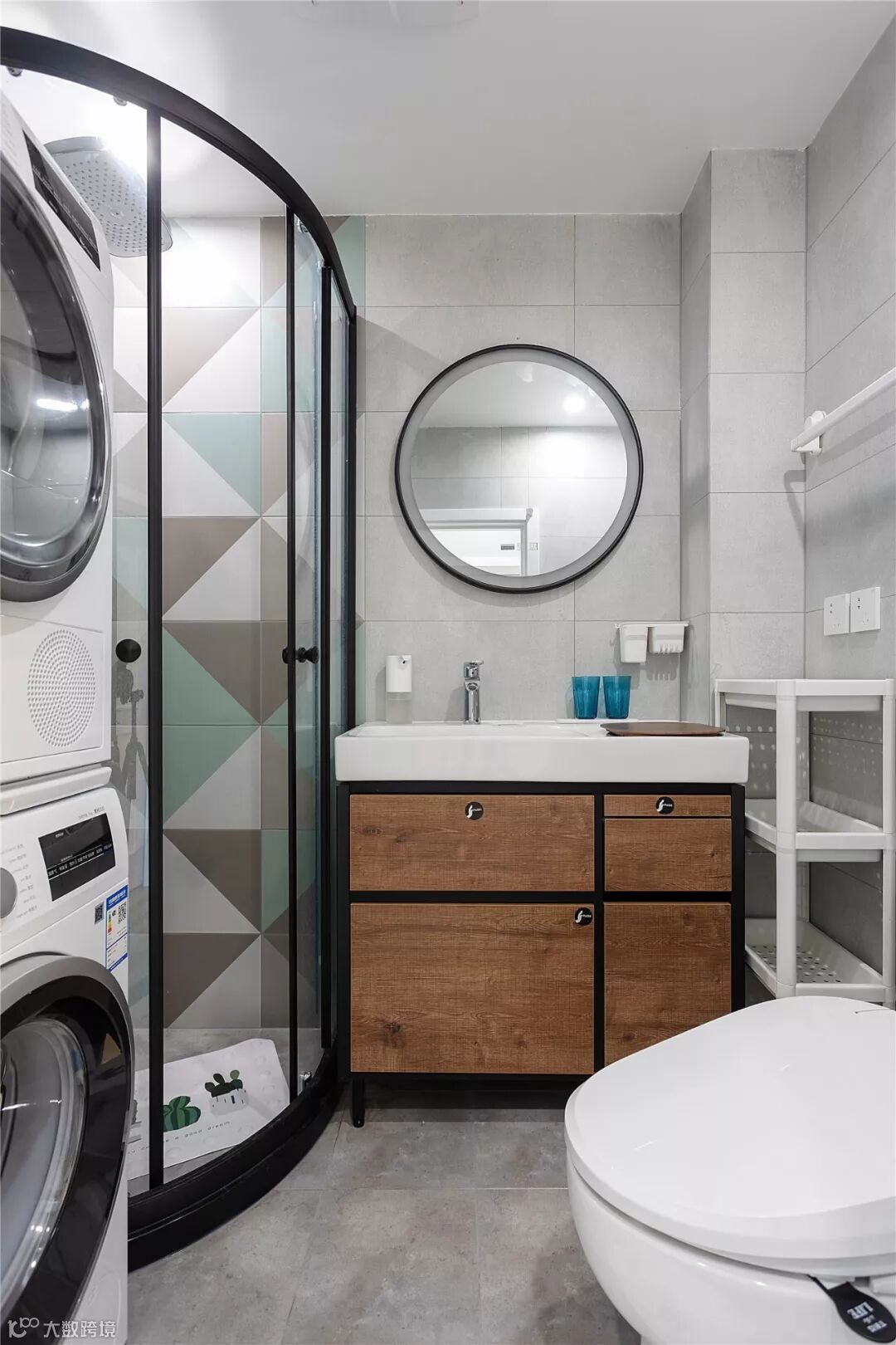 ▲ 卫生间通过扩充后,同时满足了淋浴区、洗漱区、马桶以及洗衣机烘干机的摆放,依旧是清新整洁的风格,简单又方便实用。