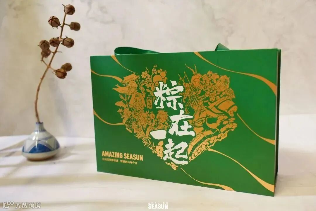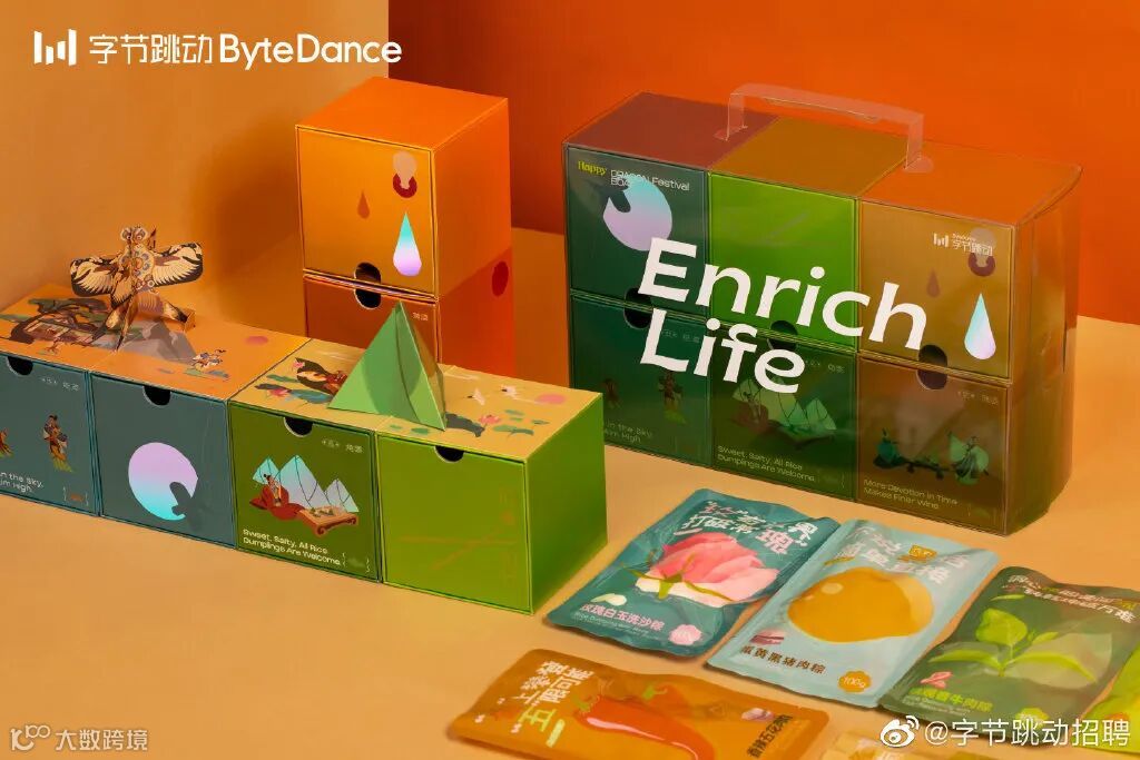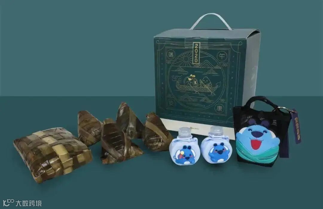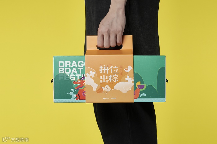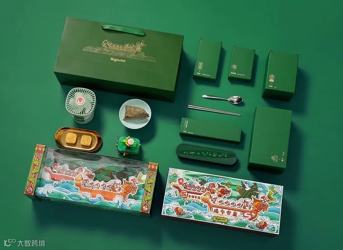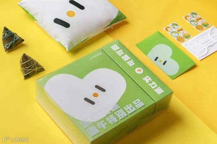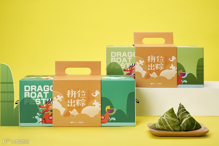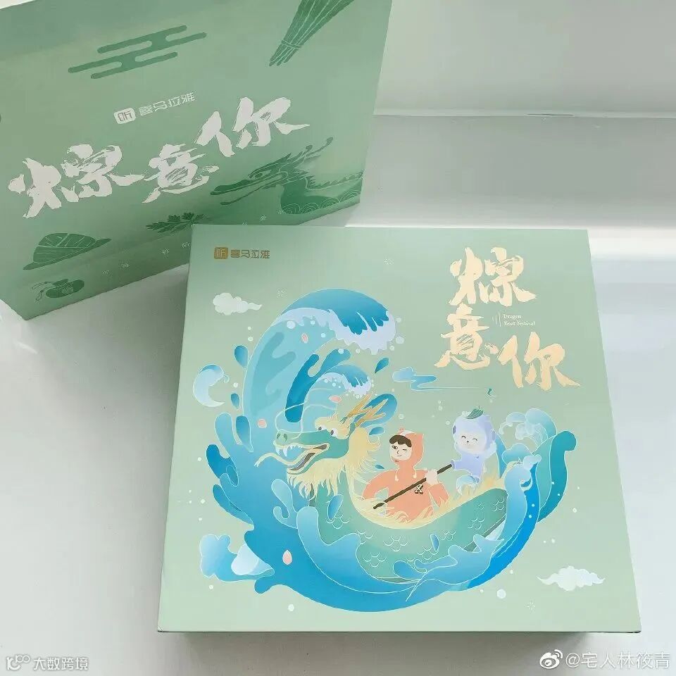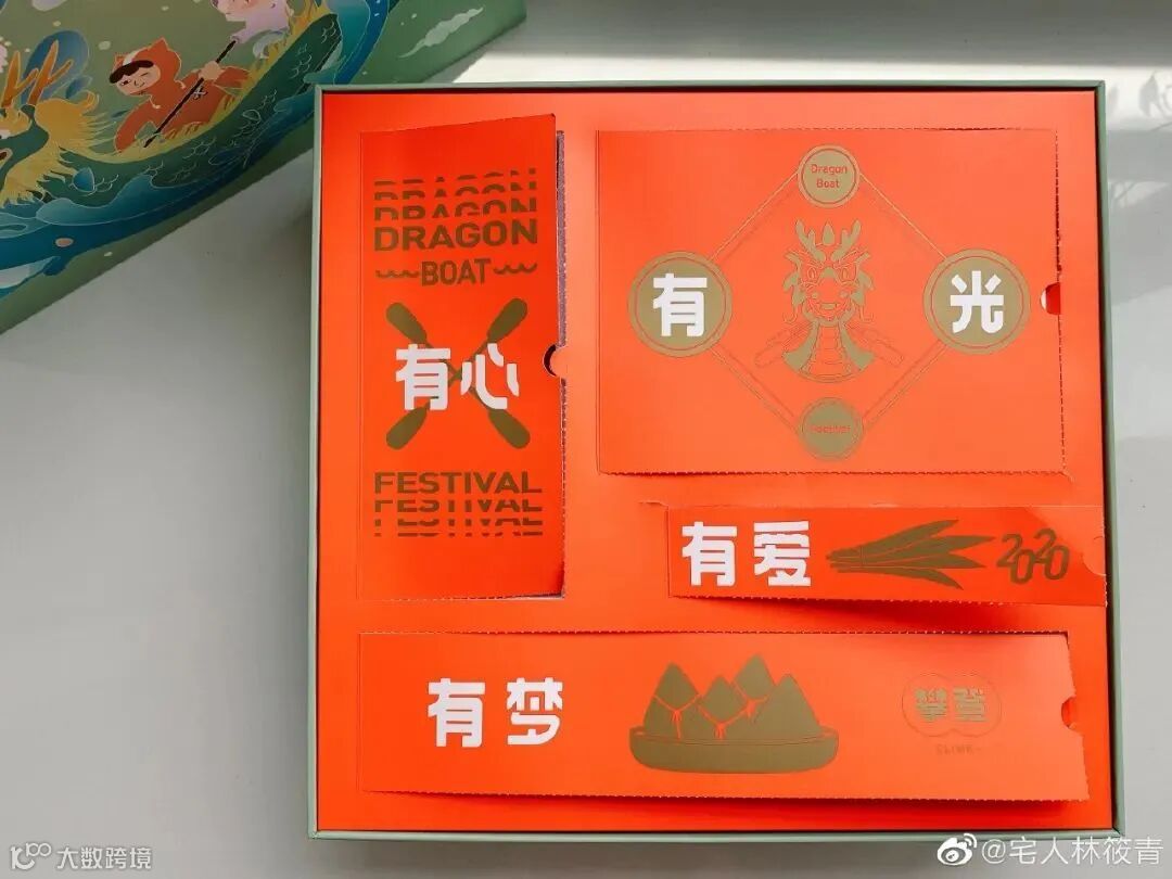 主色调就是粽子的颜色,礼盒以龙舟为灵感,附带的小旗帜上的文字也是满满字节范。中规中矩,毕竟没有周边小礼品赠送。
