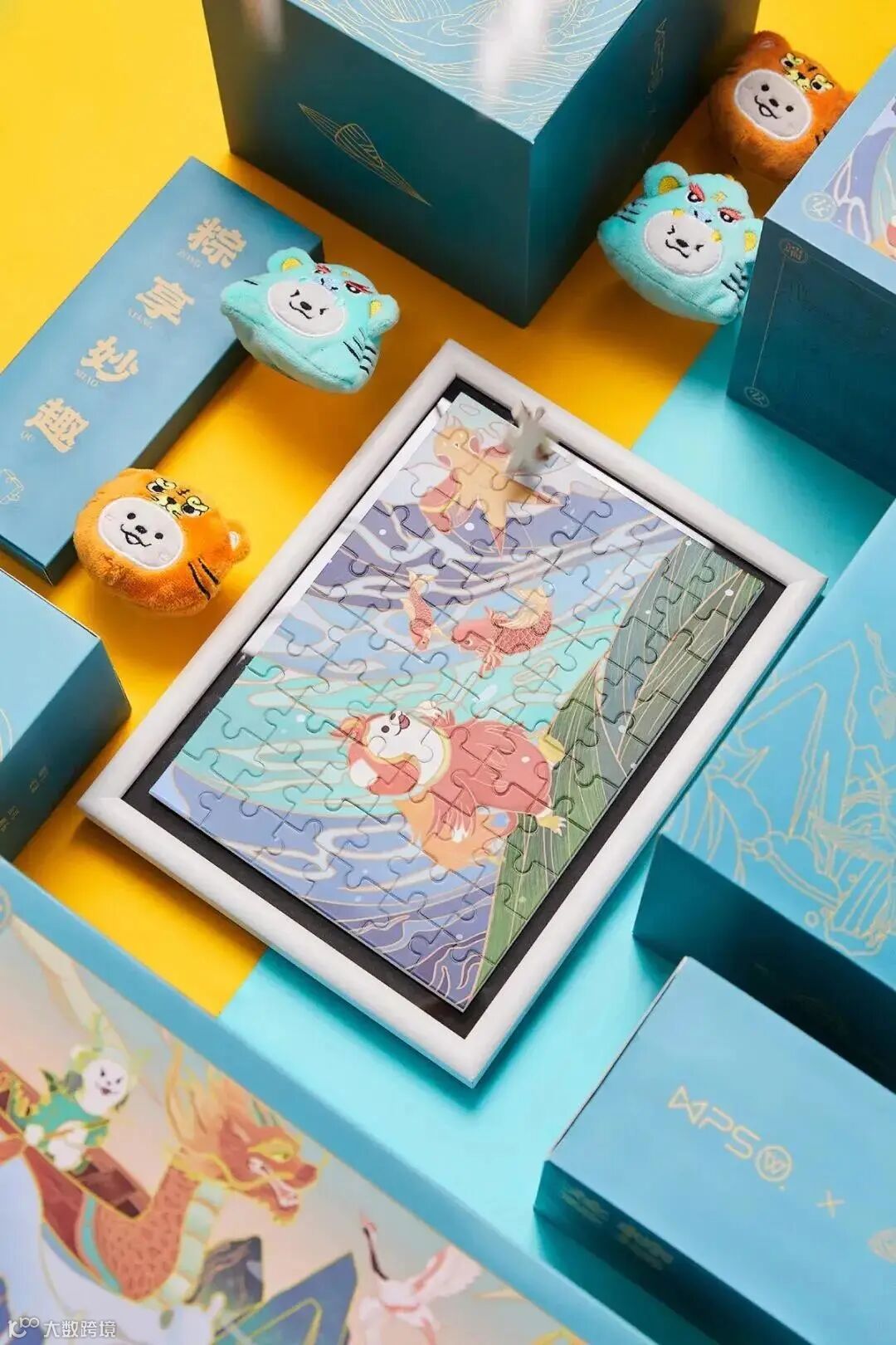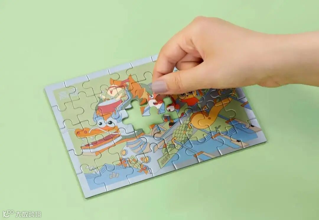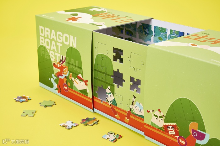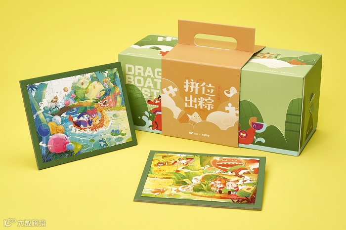 两款水杯与香囊,以粽叶和艾虎为创作灵感,寓意财富和平安,赋予传统节日应有的仪式感。拼图则是金小獴体验龙舟雄黄酒、放风筝吃粽子等传统端午习俗的场景。