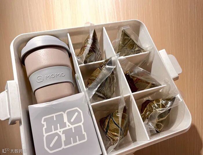 陌陌的端午礼盒也是以环保为主题,包装盒采用环保再生材质,颜色饱和度低,质感十足,重要的是可再回收,用作收纳。里面除了粽子,还有一个简约风的咖啡杯,触感细腻,可搭配挂耳咖啡使用。