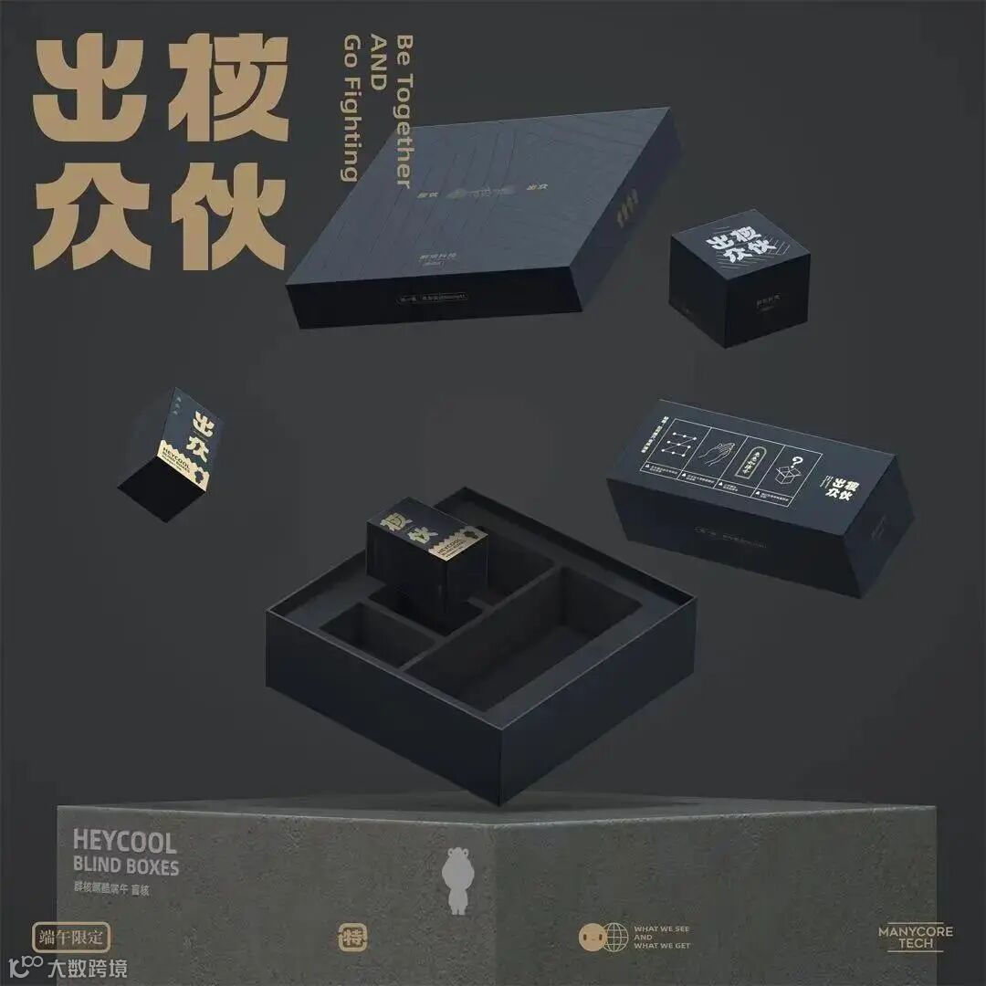 群核科技端午礼盒主题为“核伙出众”,寓意一起努力,实现梦想。外包装主打低调奢华黑,加上烫金,极有质感。内含粽子、手办盲盒。