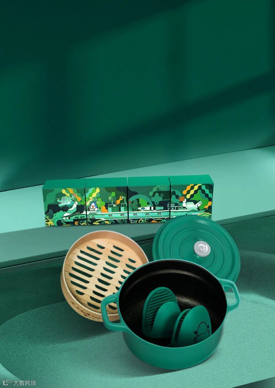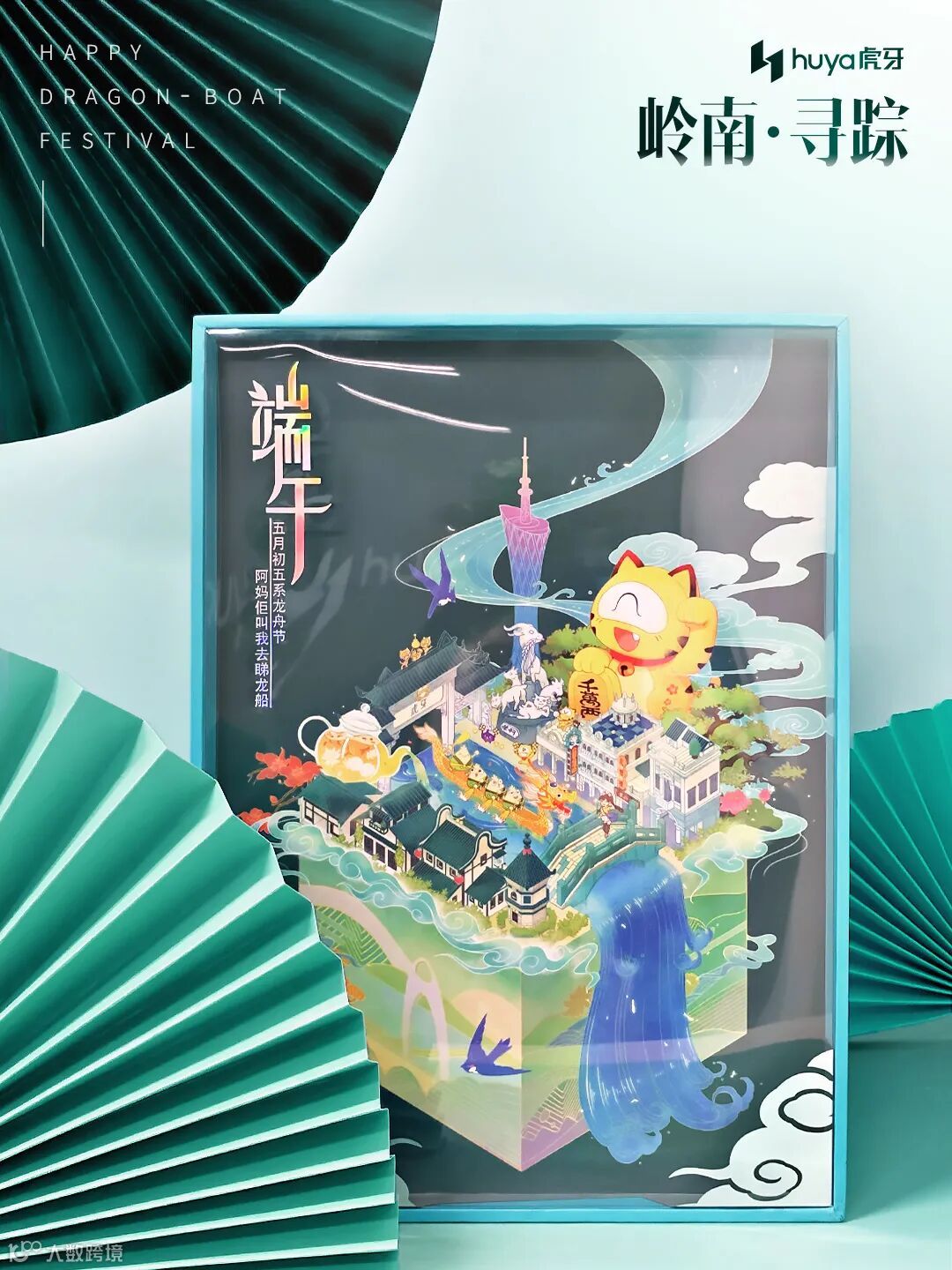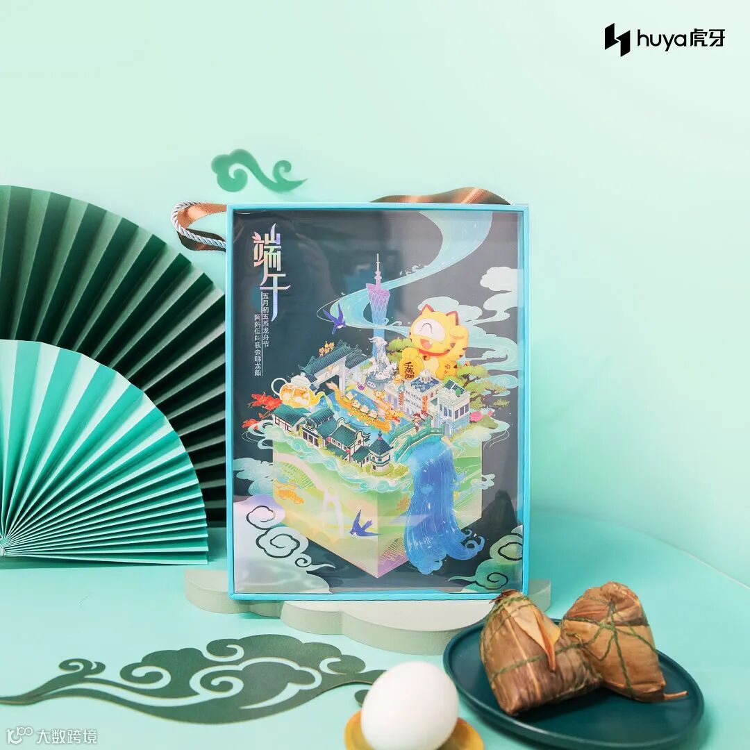 虎牙的端午礼盒「岭南·寻踪」,薄荷蓝绿色方形礼盒,夏日清新感扑面而来。正面绘制颇具特色的岭南风插画,饶有趣味,不少细节相信会让熟悉广府文化的你会心一笑。
