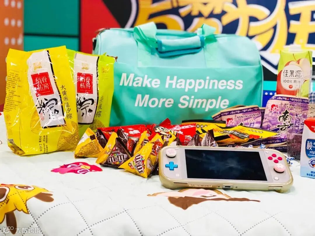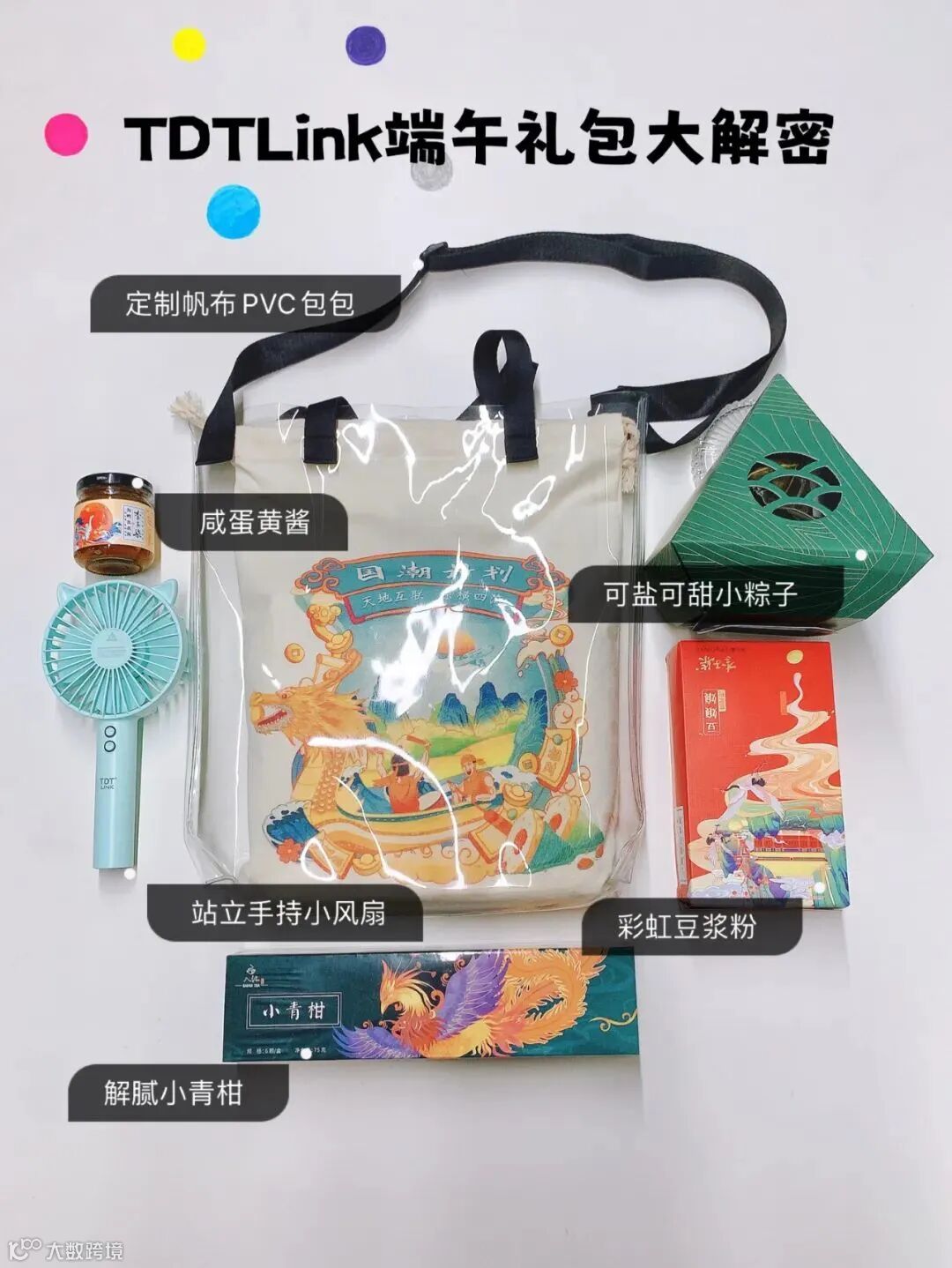 天地互联的礼盒,丰富至极。有粽子、咸蛋黄酱、豆浆粉、小青柑以及定制的PVC包包和手持风扇,从吃到用,一步到位。