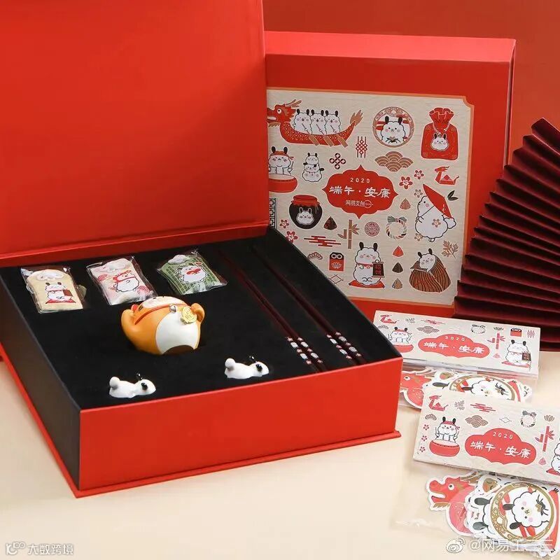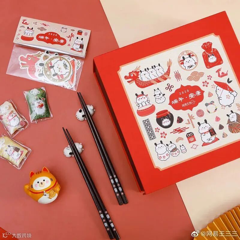 网易王三三的礼盒应该是今天最喜庆的了。里面有满满的周边小礼品,贴纸、香囊、筷子、筷子架,小摆饰等。