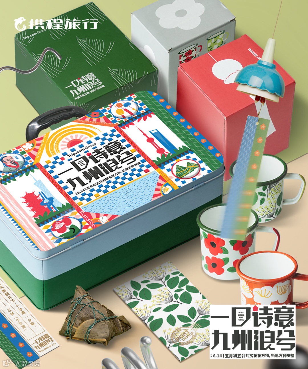 同程旅行选用了绿色作为主色。主题为"所有礼盒,粽将美好",运用了谐音梗。除了粽子,也附赠了扇子和可携带小风扇,看来同程很注重夏季防暑。