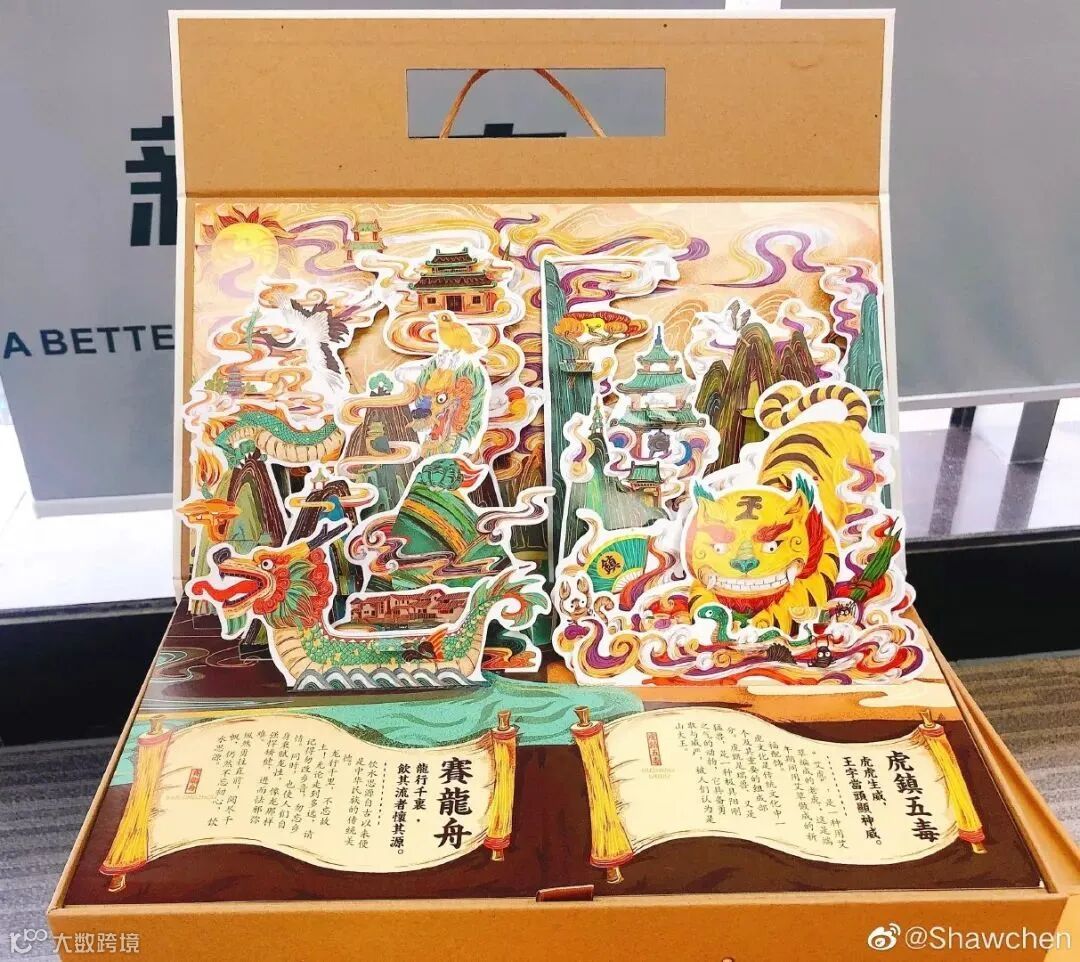 很有中国风和设计感的一款端午礼盒,礼盒内的立体图片,展现了端午的传统习俗景象,还加入了传统习俗的解释,重心在对传统节日的普及,非常用心。