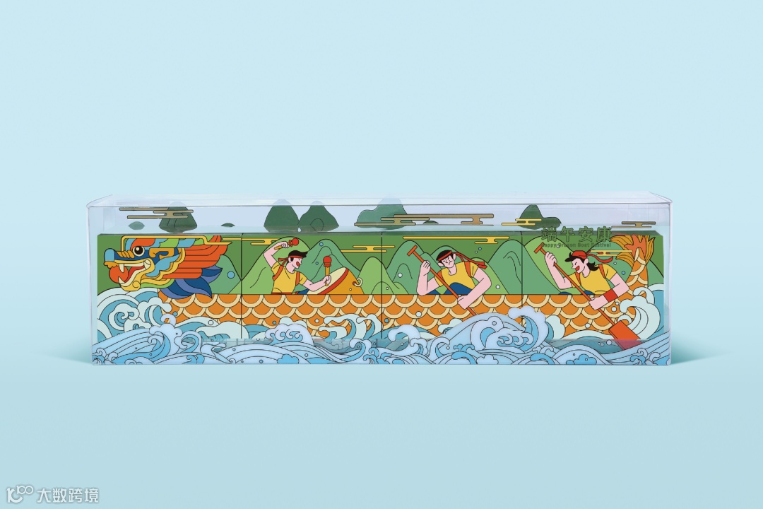 每日优鲜的礼盒可以说是最有立体感的礼盒了。对开式礼盒设计打开之后,一艘霸气的龙舟就出现了,还有俩个小人在龙舟上划着桨,再一看礼盒图案,这不就是赛龙舟的湖面嘛!