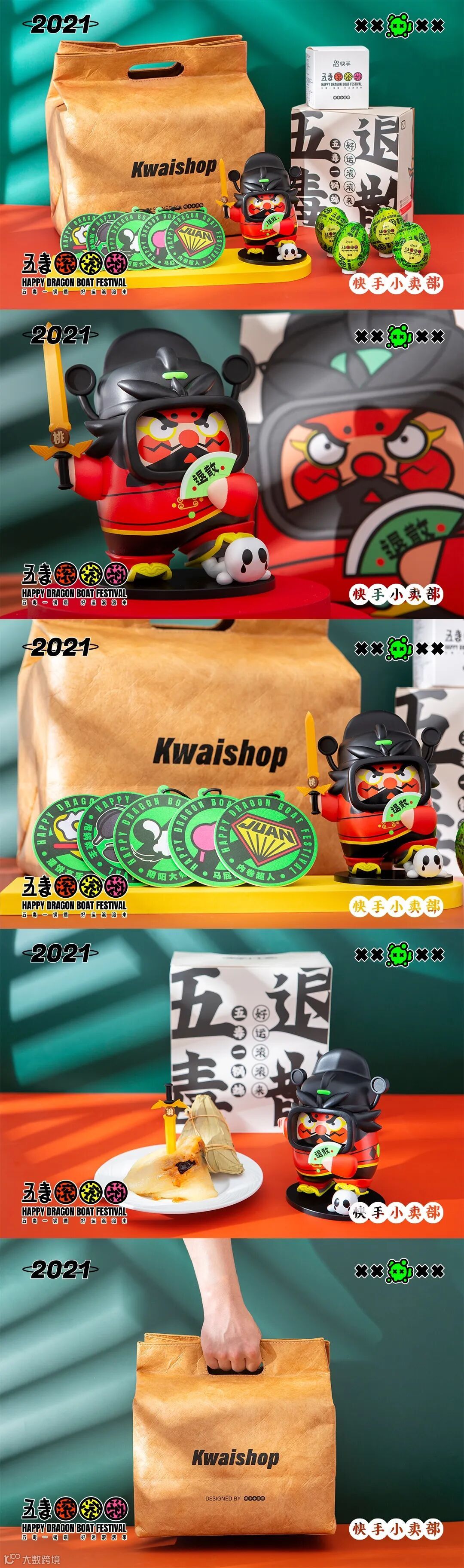 快手小卖部开发的“五毒滚滚滚”端午礼盒,整体创意来自端午节传统的避五毒习俗,结合互联网话题,重新将甩锅教主、阴阳大师、灌饼高手、马屁御史、内卷超人定义为互联网新五毒。