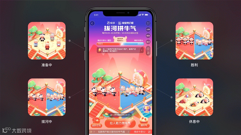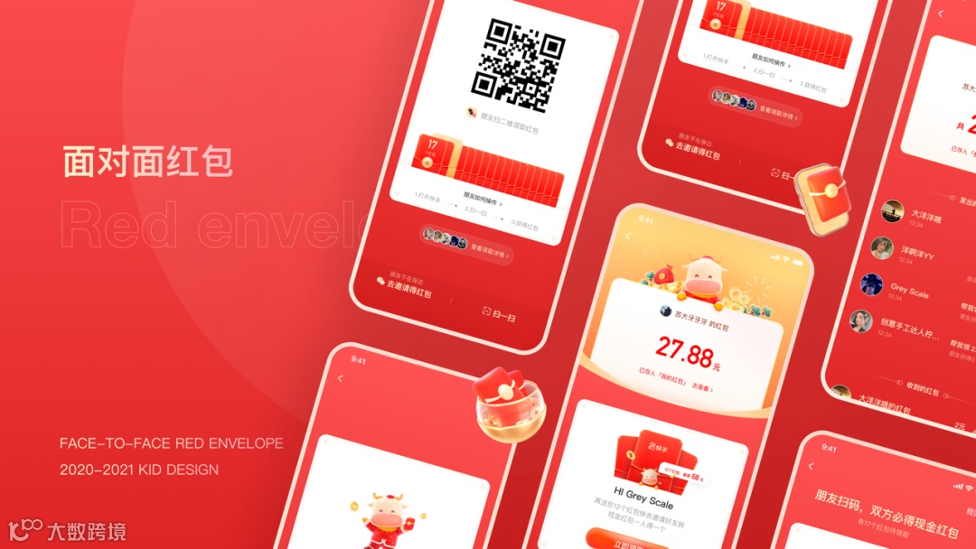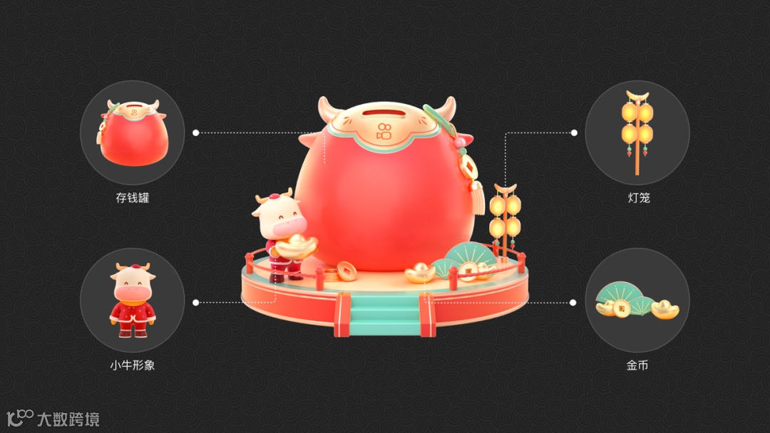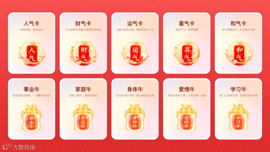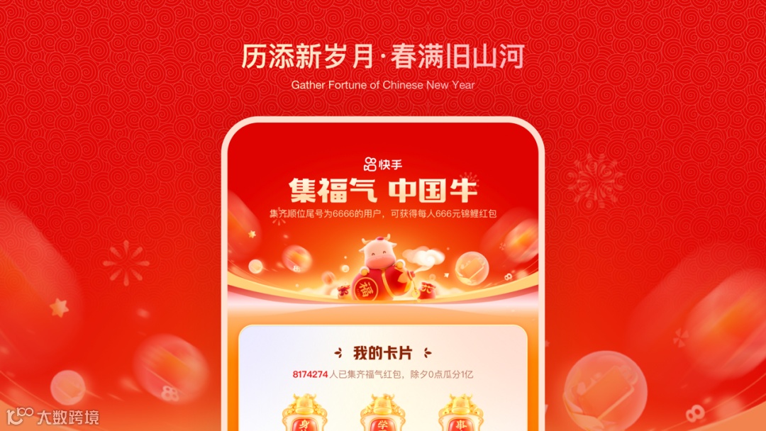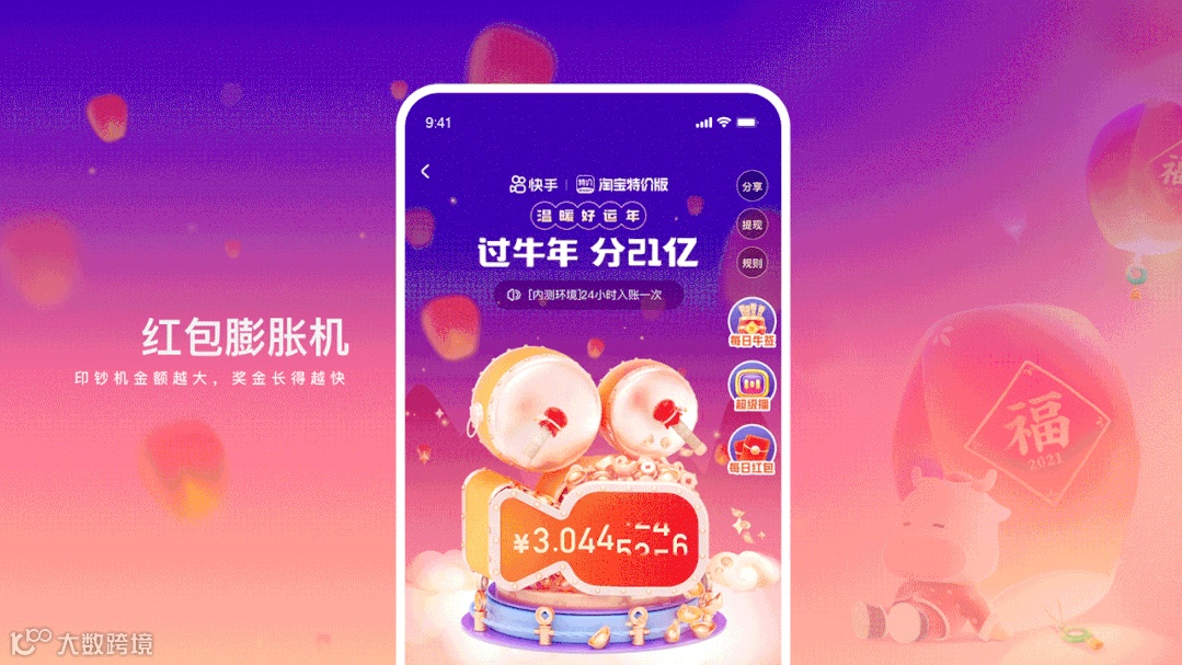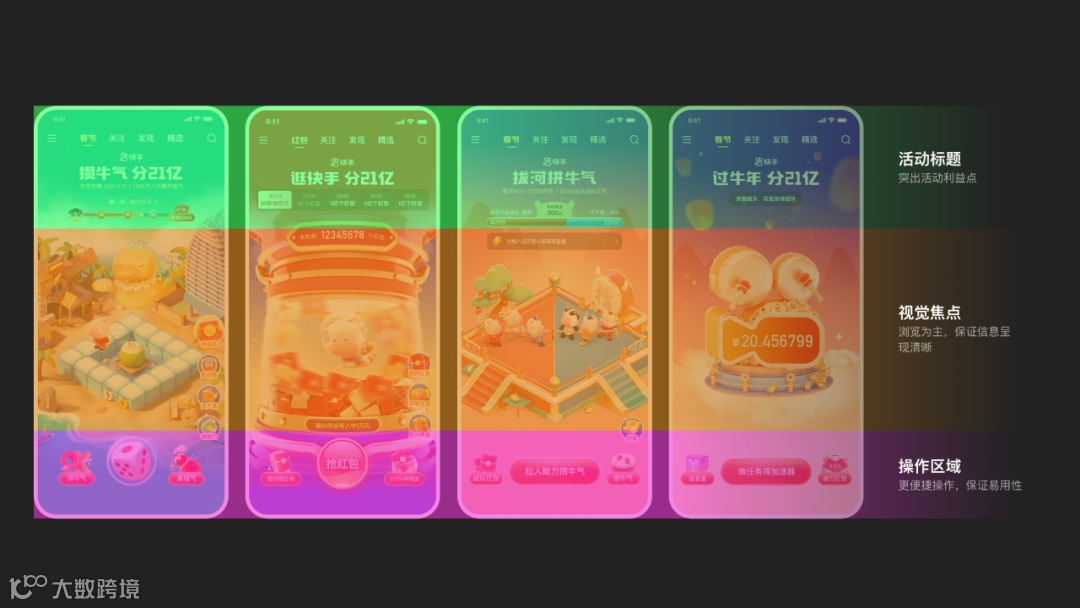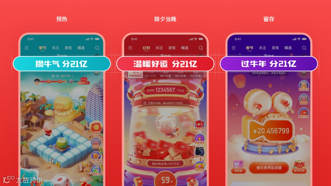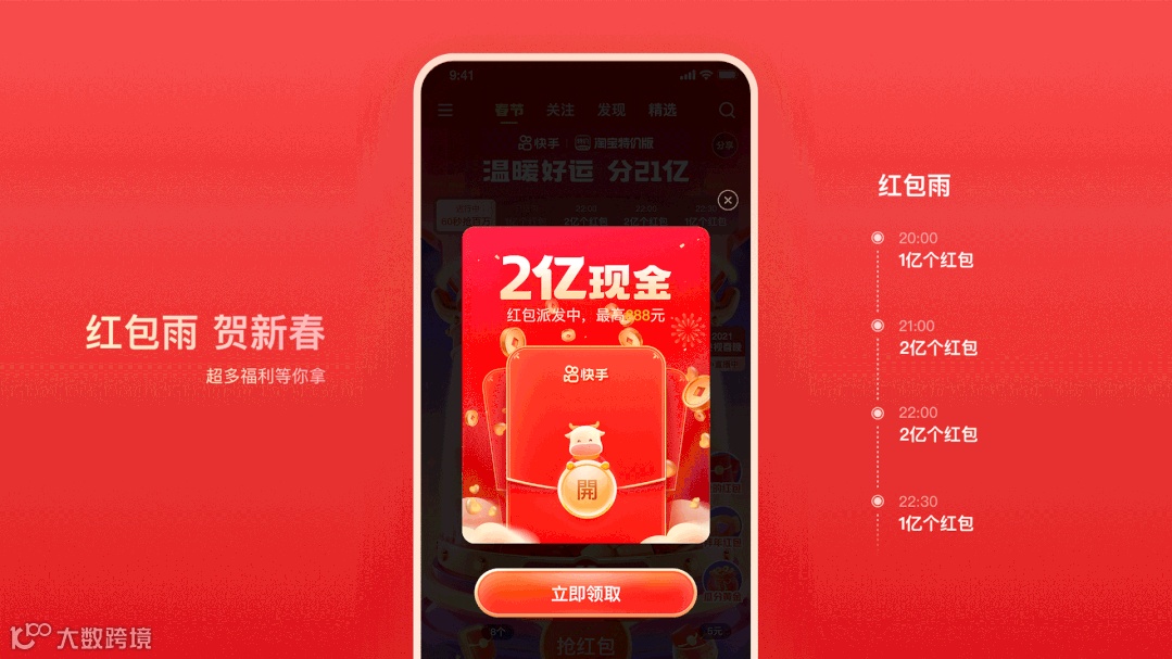 以“牛角”作为核心元素呼应牛年这一主题,突显“分21亿”传递核心利益点,以“红、金”为主的配色强化春节氛围。