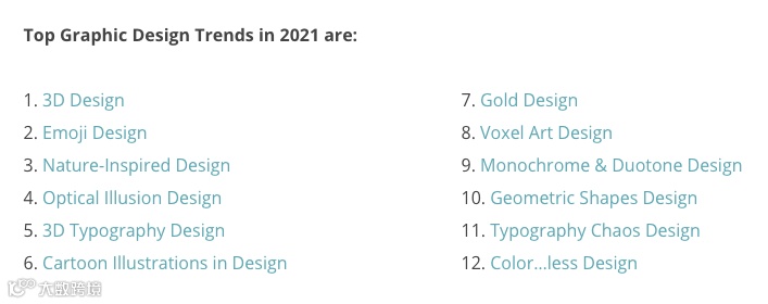 每年年底,各种网站都会陆续发布来年的设计趋势。今年我们首先迎来了GraphicMama对2021年设计趋势的预测,一共有12种类型: