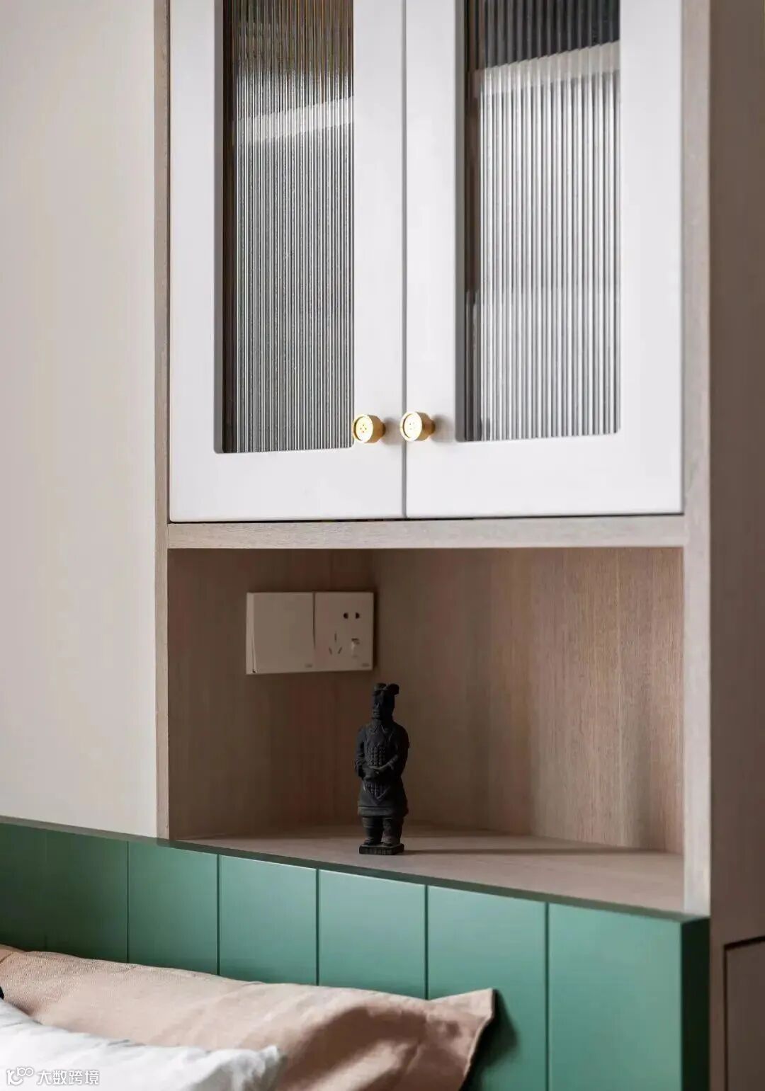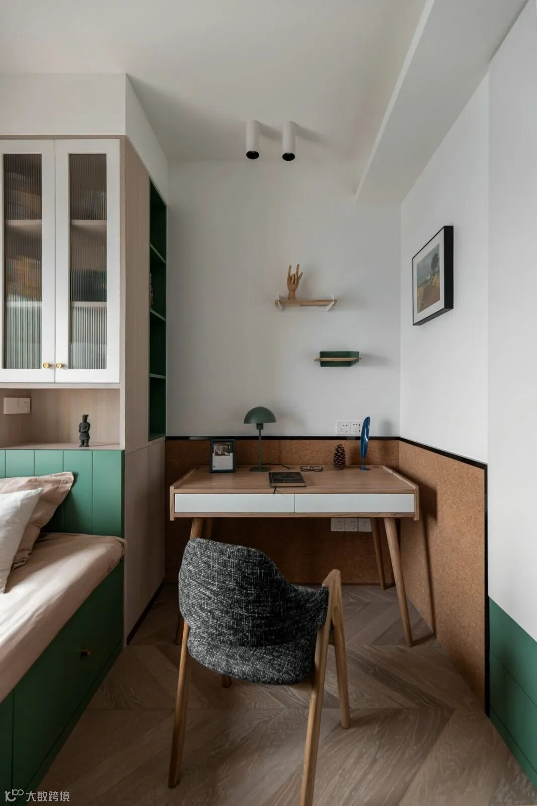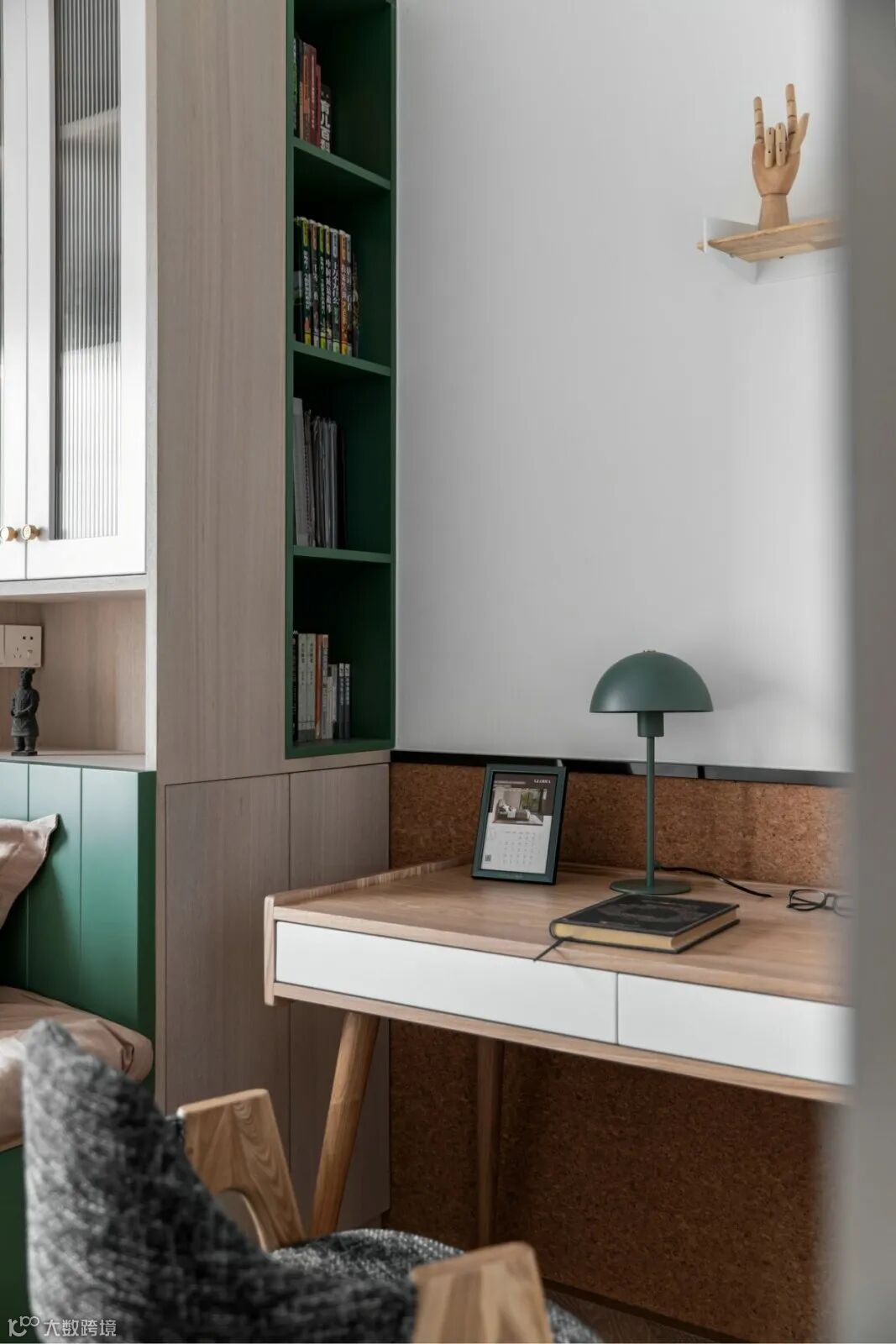 绿色从床背景蔓延至顶面、柜面