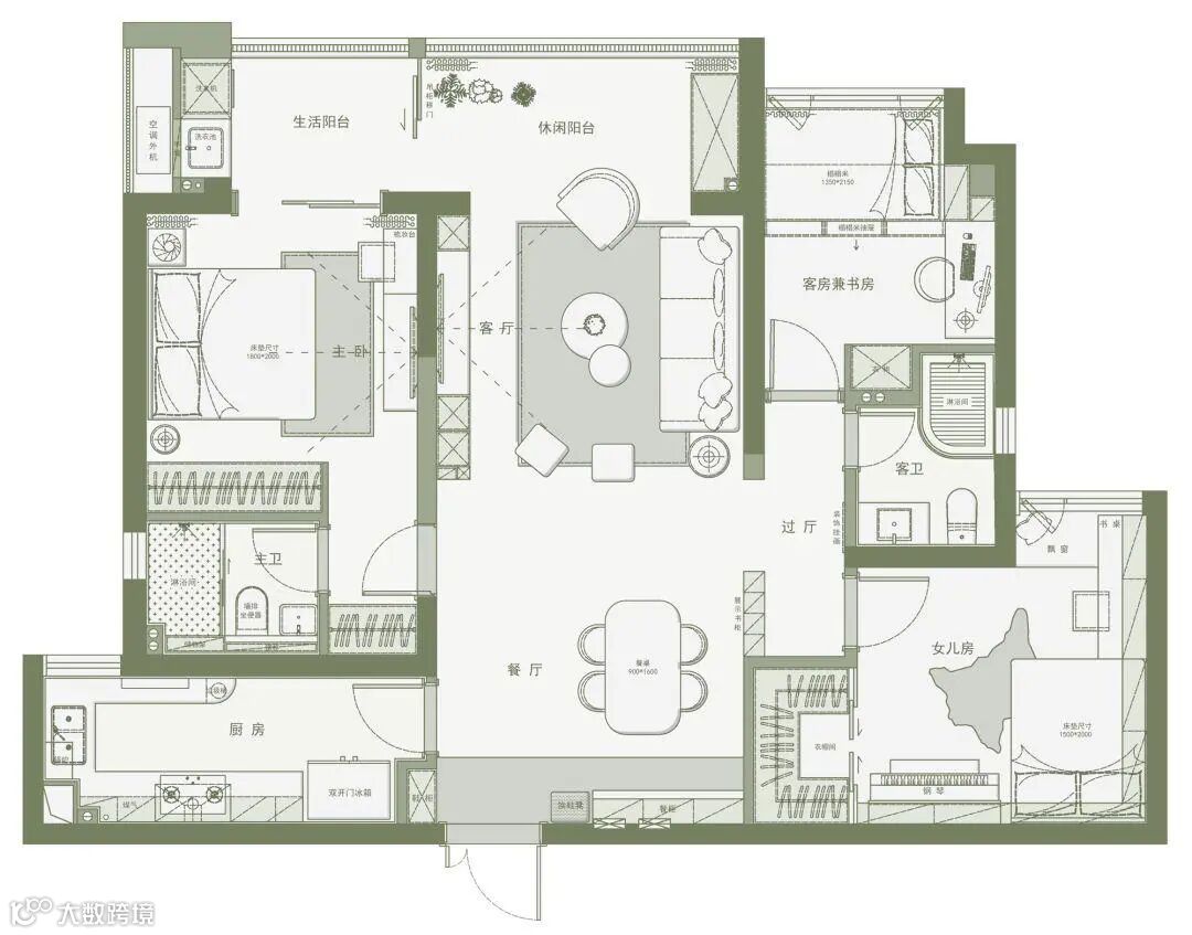 本案业主为三口之家,是业主的改善住房,男女业主喜欢的风格差异较大,女业主喜欢色彩靓丽并且充满活力生机的家居空间,而男业主则喜欢极简黑白灰冷峻的都市风,这两种风格很难融合,最后我们商讨出软装色系方面还是以女业主喜好为主,而硬装呈现则结合现代简约风的设计手法,最终才有了这套绿意盎然的现代休闲风作品……