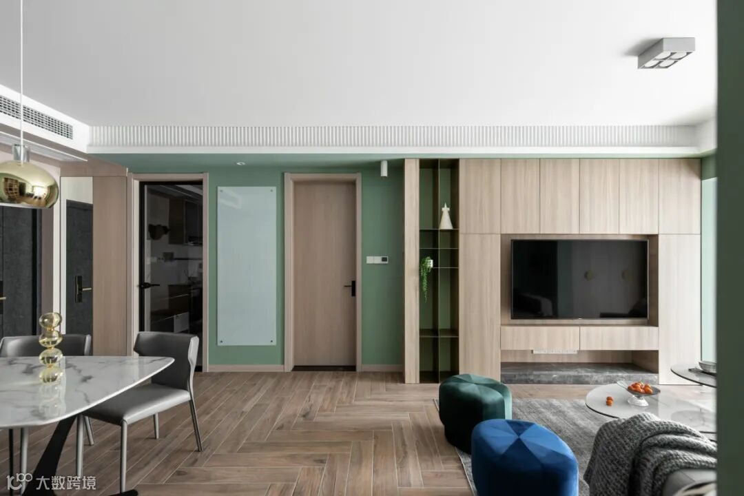 整体定位现代休闲,整屋大色块手法处理,原木色饰面板+3种绿色+藏蓝色局部跳色。整屋人字拼地板砖、鱼骨地板铺设,色调清新淡雅,轻松舒适……