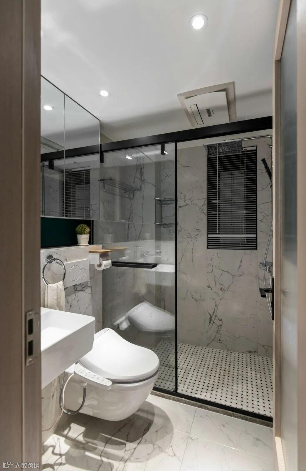 5.主卫面积缩小,使用壁挂盆和墙排马桶,多出的空间给主卧增加一组长衣柜