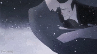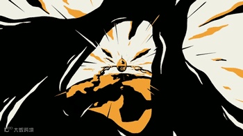 另一个「爆炸」转场的进化范例,利用主角的眼睛、头发、道具、火焰的动态快速佔满画面做转场。