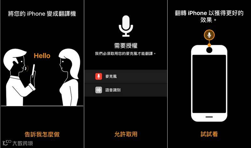 待程序安装完毕启用,系统会先要求使用者授权麦克风功能才能辨识语音,建议将设备 180 度上下翻转让麦克风朝上,好让系统清楚接收使用者语音讯息,接着系统会按照设定语言,即时将语音转换成文字后进行翻译。