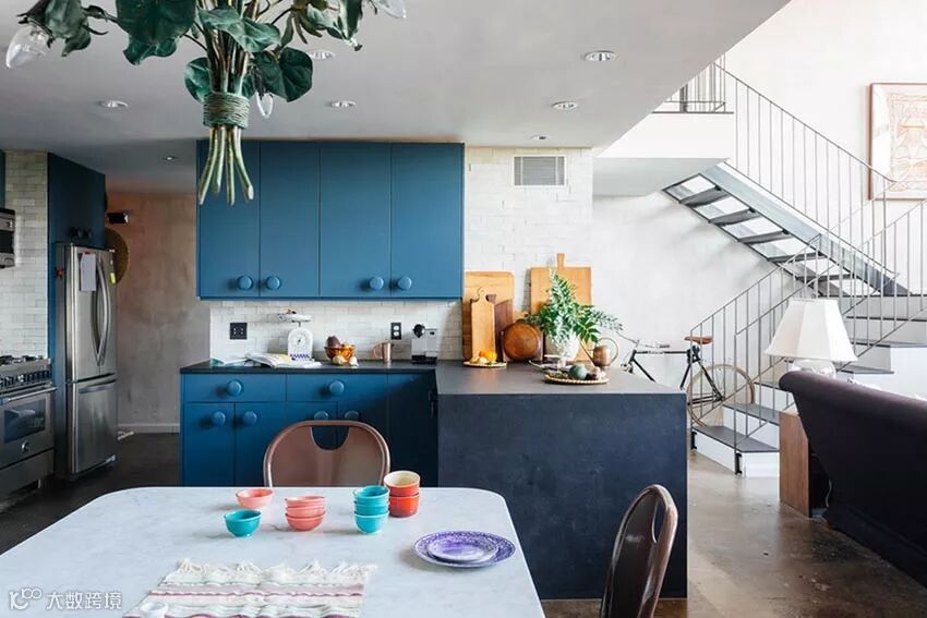 一角的L型厨房没有用到上层橱柜,看起来更简洁大气。黑色Smeg冰箱+黑色哑光橱柜+黑色油烟的配置实在太酷。