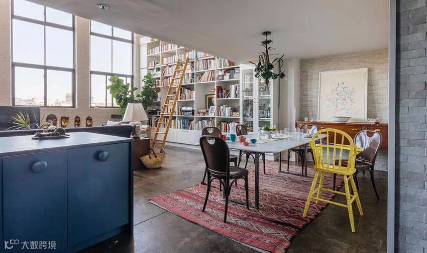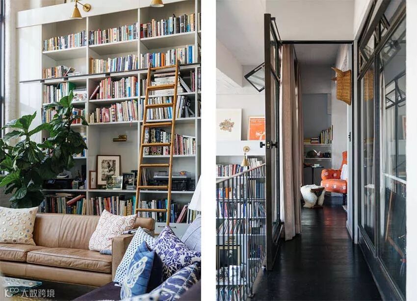 纽约设计团队 Space Exploration 在处理这个家的挑空问题时,就仿效图书馆,用一座高接近4米的大型书柜,配合屋主收藏的书籍、艺术藏品,使这面书柜墙成为整个家充满生活味的中心!