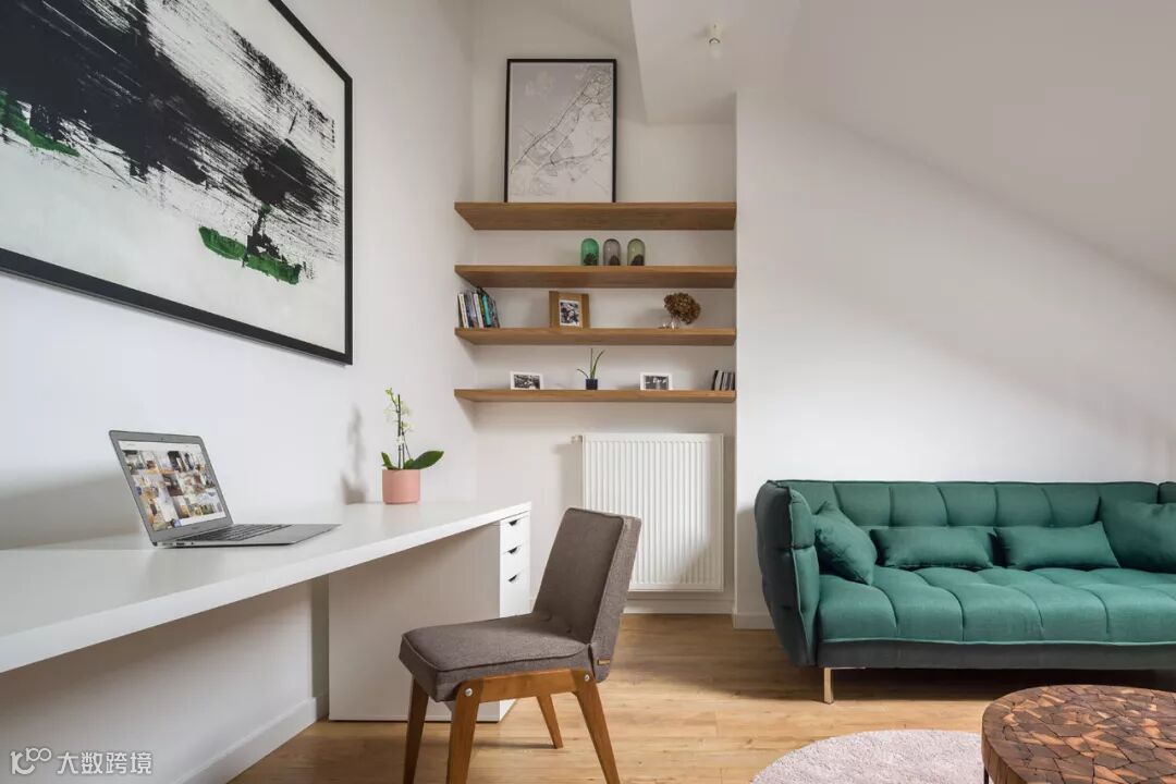 因为二楼空间,形状上和颜色上都不如一楼丰富。于是,墨绿色的沙发在此起到了关键的提亮作用,给整个空间带了了活力。