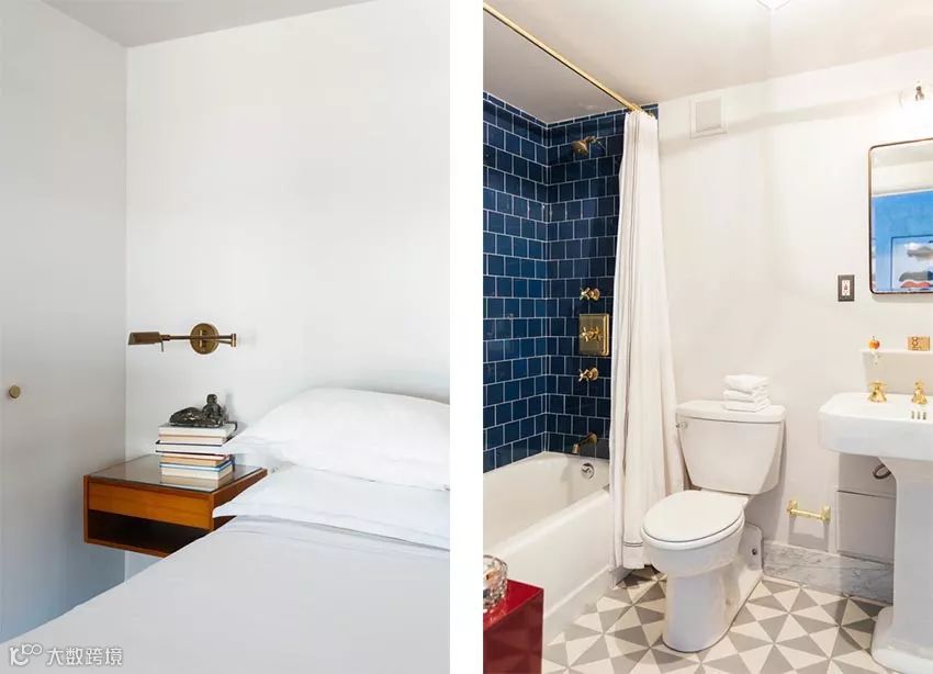 亮面如同海洋般蓝色的瓷砖+金色复古五金,沐浴梳妆这件事,还是值得好好对待的。