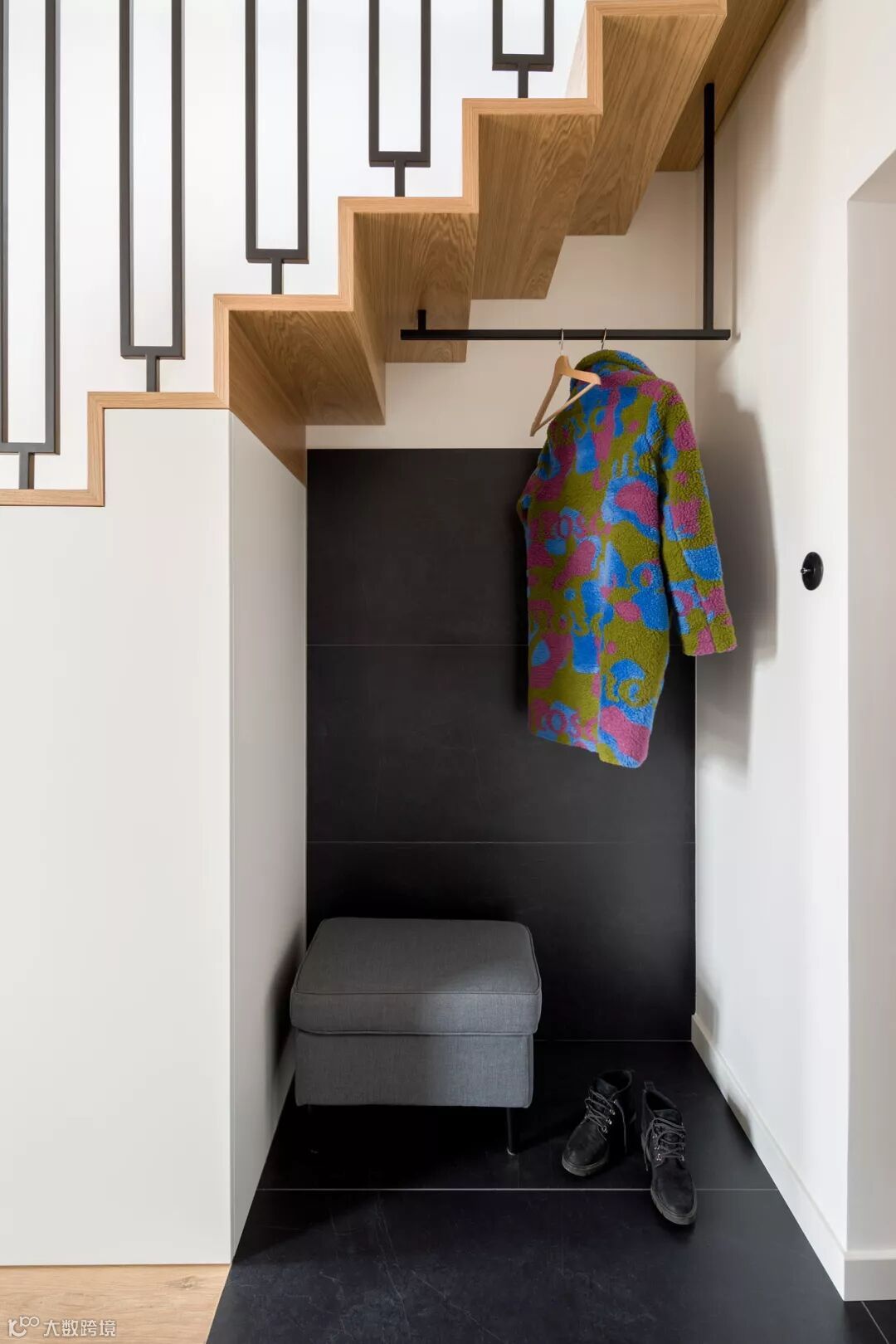 楼梯下用挂衣杆+收纳柜的组合,既使得空间不浪费,又完美地完成了入门玄关的打造,一举两得。