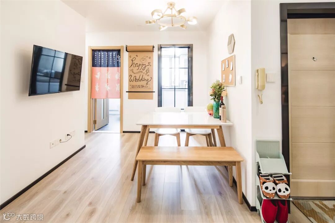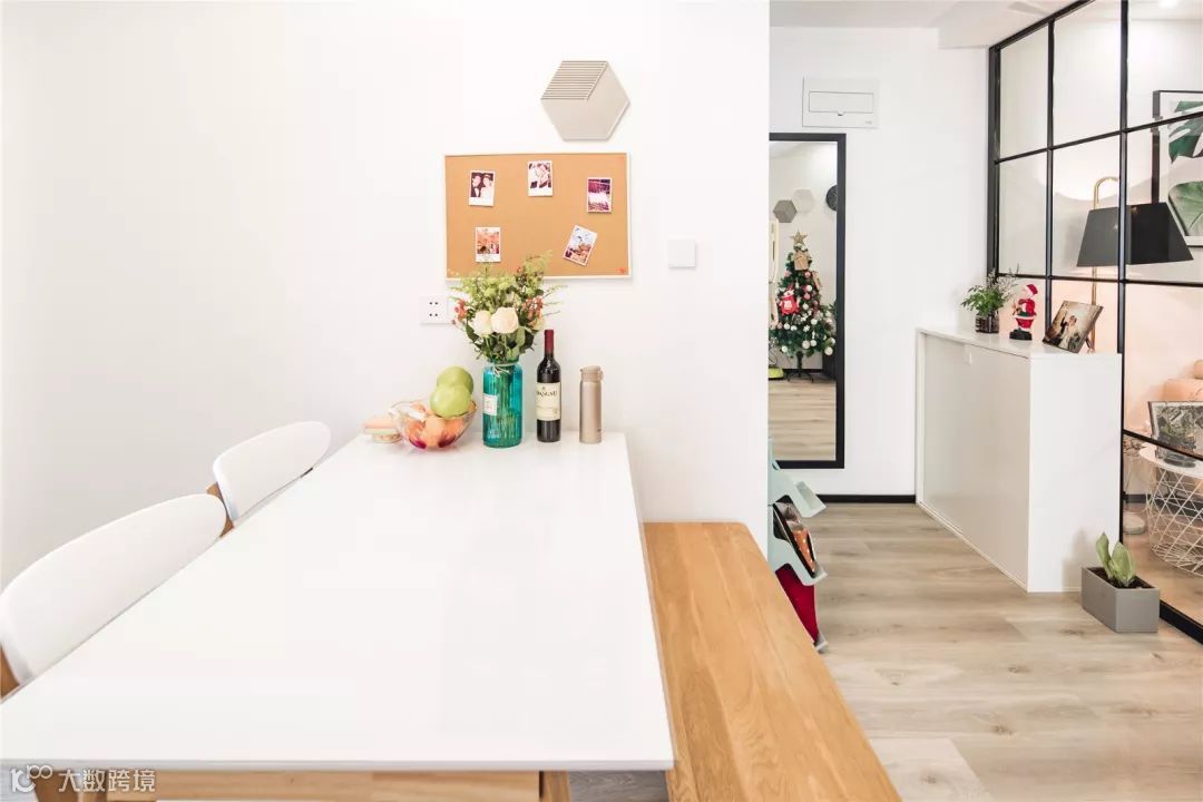 一进门就是入户玄关,左边墙上挂了一面全身镜,出门前一定要打扮的美美哒,右边则放置了一个简易的拖鞋架。餐厅的木凳充当临时的换鞋凳,经济实用。