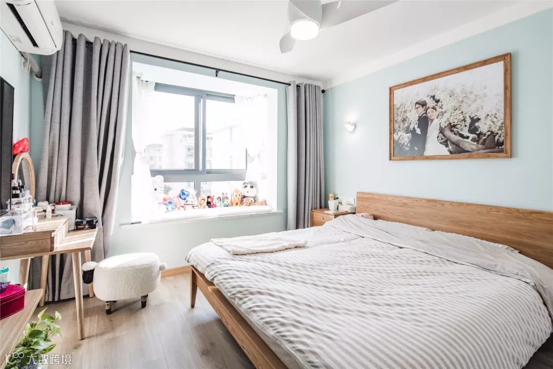 主卧的床、床头柜、梳妆台,连婚纱照的边框都是木质的。满满的日式风。