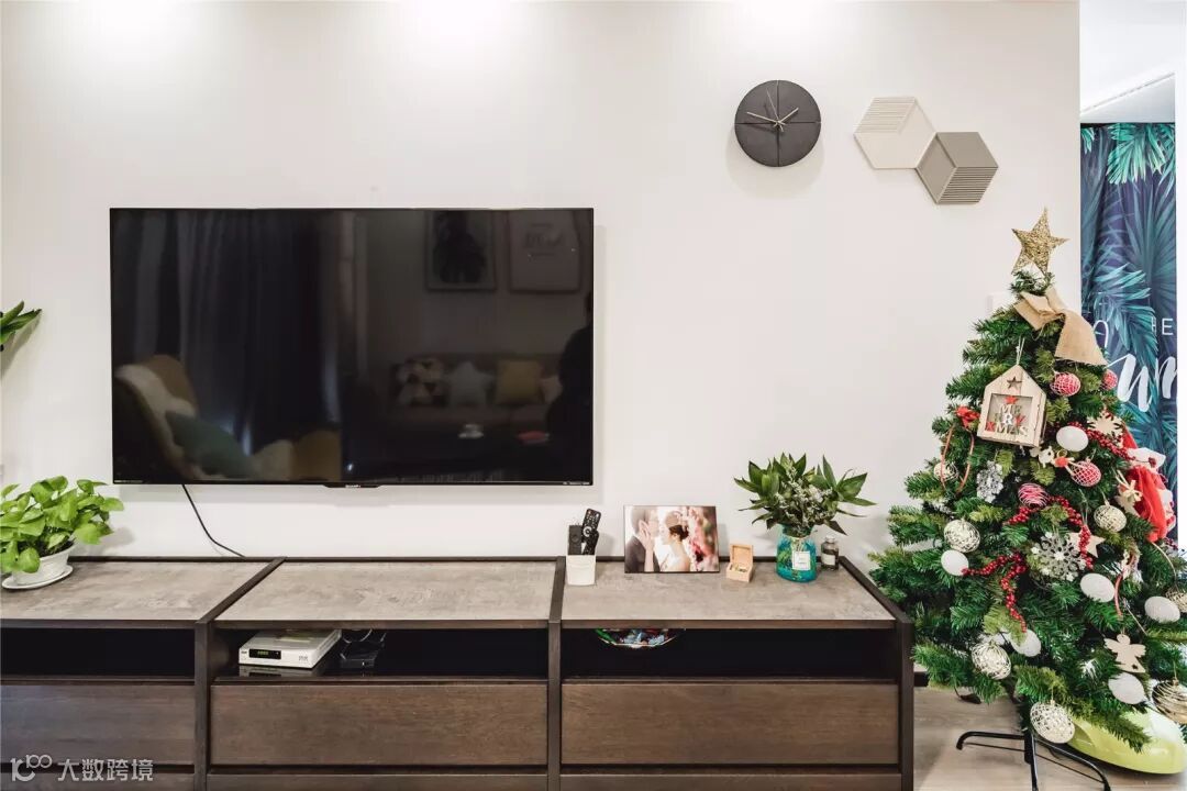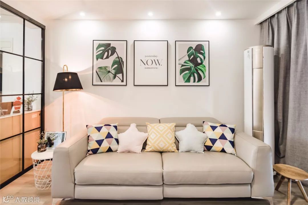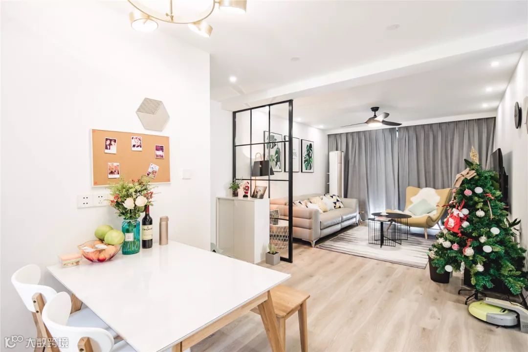 入户的玄幻跟客厅间进行了隔断,黑框格子玻璃隔断,大大增强了整体的空间感。