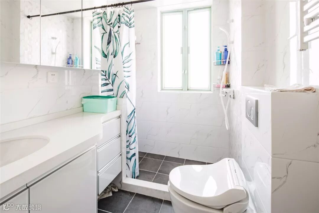 卫生间也是以白色和灰色为主,淋浴器用一款清晰的绿植布帘隔开,整个卫浴空间给人干净利落的感觉。