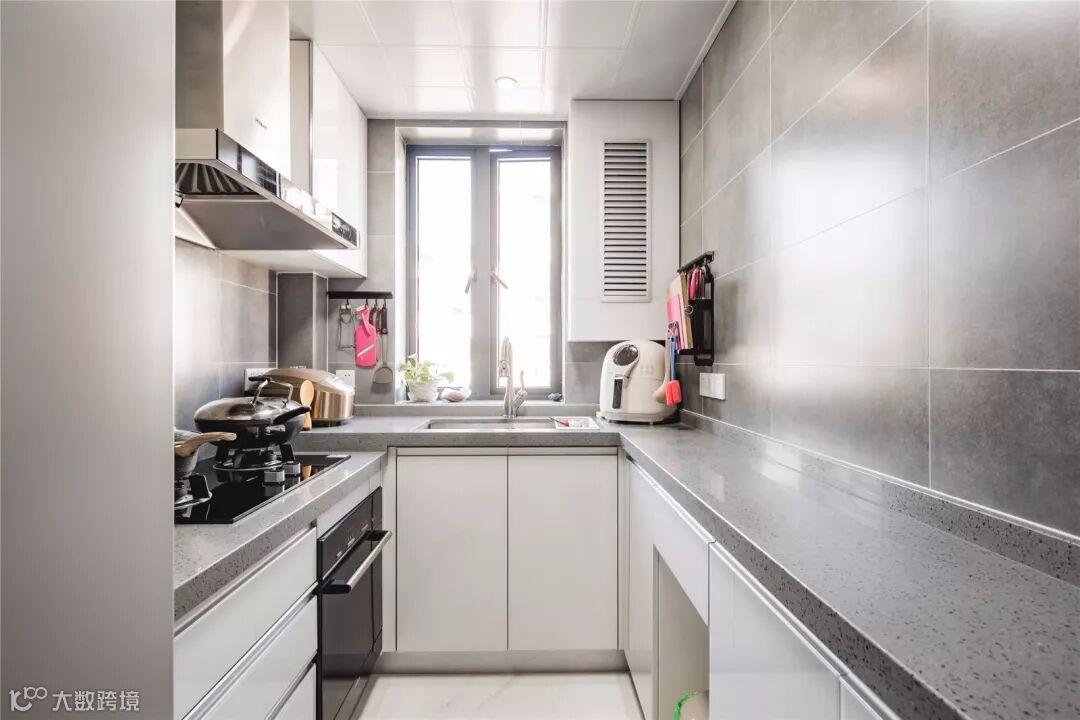 为了呼应房屋整体的色调。厨房也选择了灰白色,简洁大方。