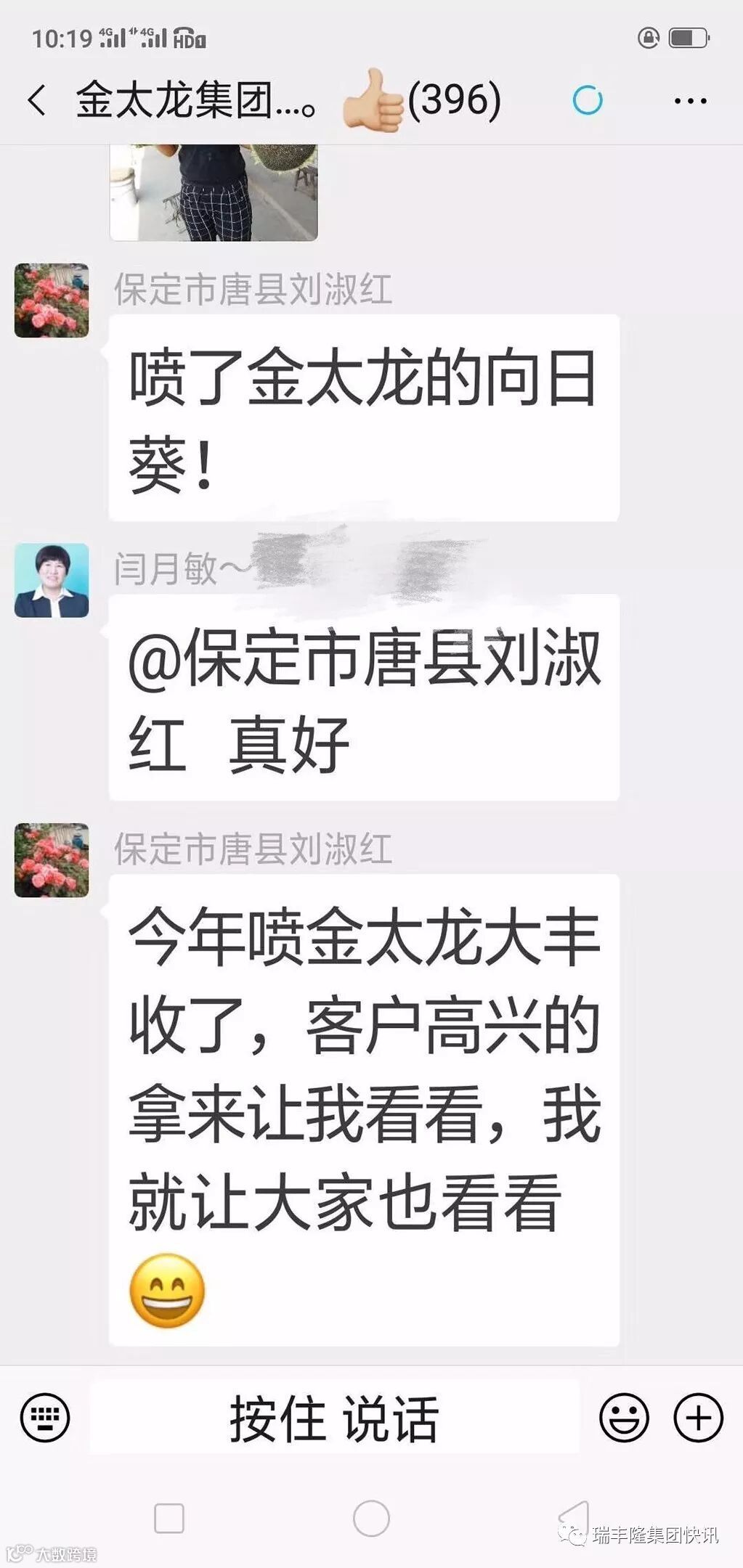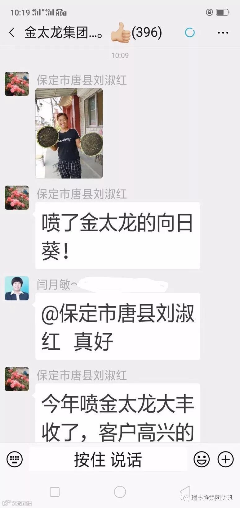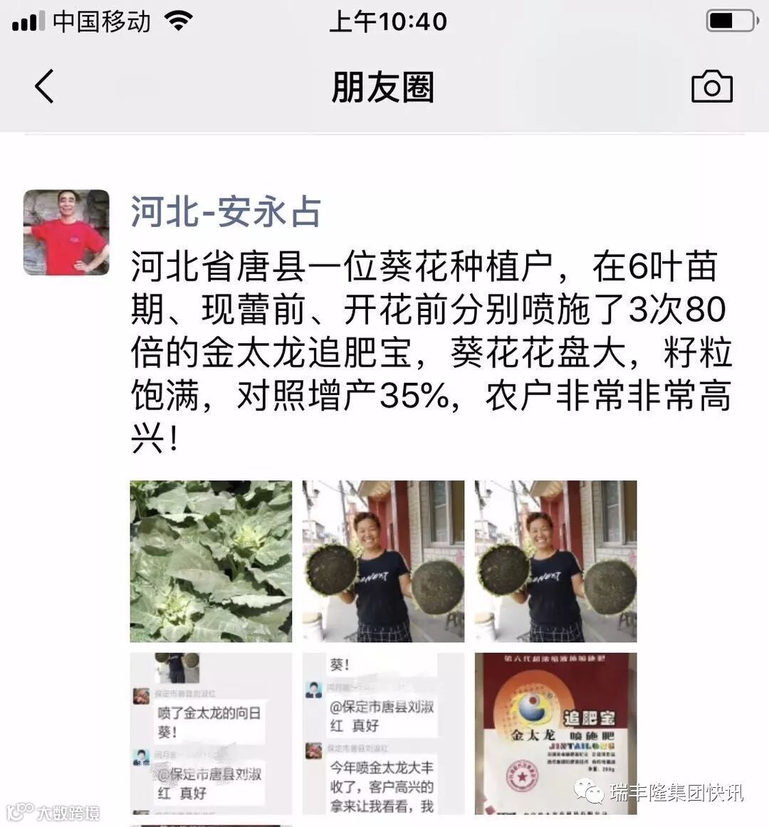 河北省唐县一位葵花种植户,在6叶苗期、现蕾前、开花前分别喷施了3次80倍的金太龙追肥宝,葵花花盘大,籽粒饱满,对照增产35%,农户非常非常高兴!