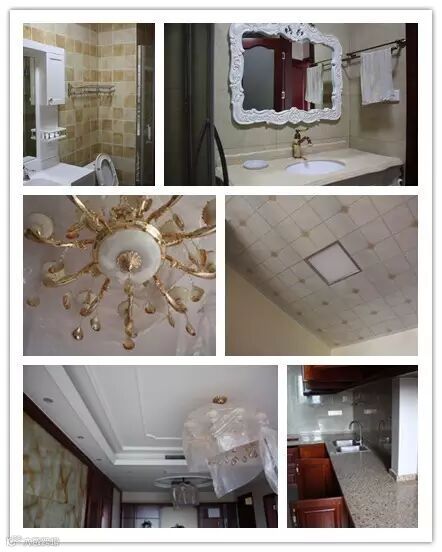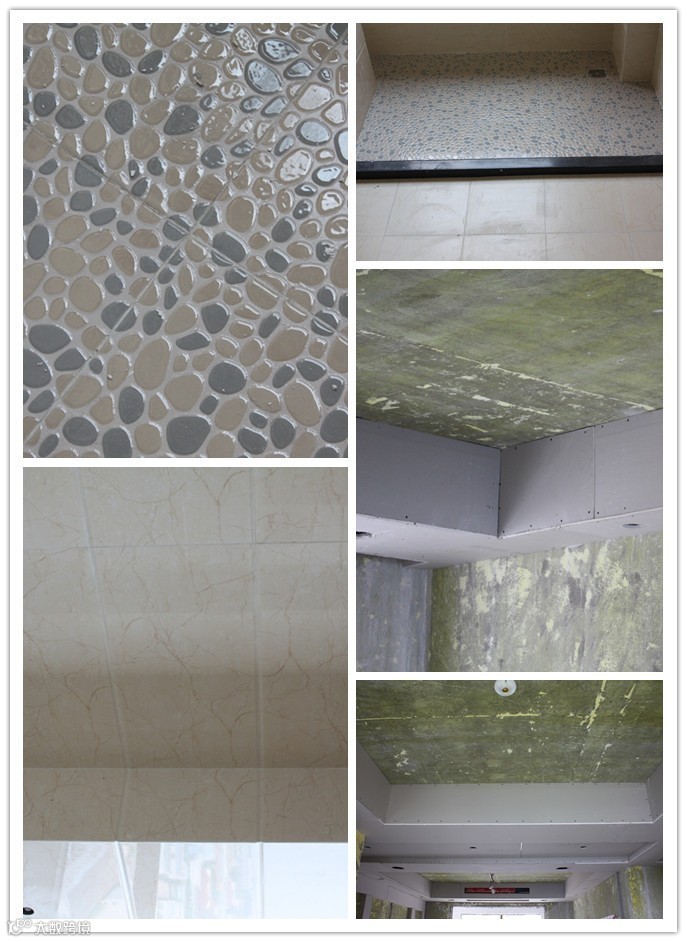 贴砖工艺平整美观,清清爽爽。吊顶边角整版剪切,轻钢龙骨配合木龙骨。