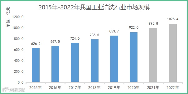 据中商产业研究院相关报告数据显示,我国工业清洗行业规模连年增长,有望在2022年突破千亿大关。