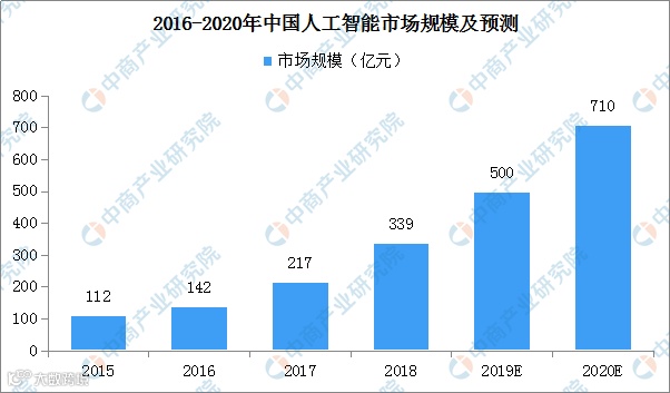 自2015年开始,中国人工智能市场规模逐年扩大。随着人工智能技术的逐渐成熟,科技、制造业等业界巨头不断深入布局。数据显示,2018年中国人工智能市场规模约为339亿元,增长率达到56.2%。据预测,到2020年,中国在人工智能的市场规模将突破700亿元。
