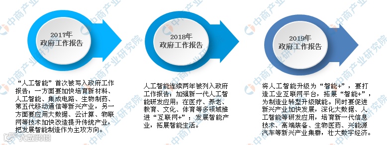 我国政府高度重视人工智能的技术进步与产业发展,人工智能已上升为国家战略。在2017、2018以及2019年连续三年的政府工作报告中提到人工智能,可以看出在世界主要大国纷纷在人工智能领域出台国家战略,抢占人工智能时代制高点的环境下,中国政府毅然把人工智能上升到国家战略的决心。