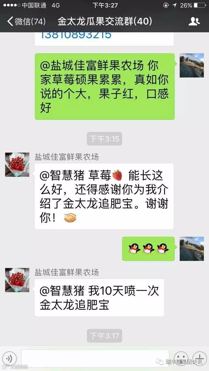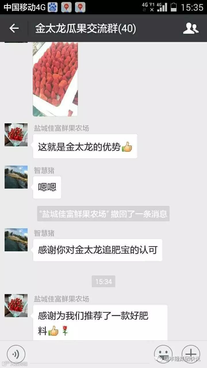 瑞丰隆集团快讯不只是听说——草莓和金太龙更配!江苏盐城的草莓2017年度新上市,喷施金太龙后果大饱满,颜色鲜艳,口感佳!据用户的聊天记录:大概10天左右喷施一次金太龙,不需要再多花钱控旺就可以做到花壮果多!既省钱又省力,关键是金太龙的效果真正的好!这就是金太龙的优势!