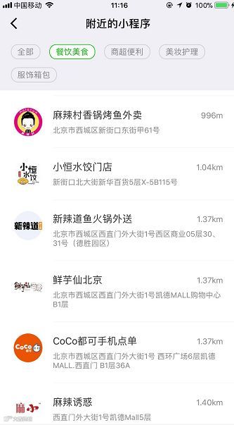 虽然“附近的小程序”是小程序中鲜有的基于LBS推荐功能,据了解,是推荐5公里之内的小程序。但和“附近的人”相比,还有一些距离。