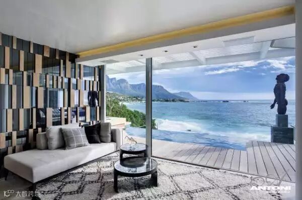 开普敦的克里夫顿之景7号公寓拥有的落地窗正面向着家中Spa区和大海。设计团队Antoni Associates所设置的落地窗可以让人身在家中就可以把窗外的美景尽收眼底——包括远处那连绵不断的十二门徒山脉和房子外一望无际的克利夫顿海滩。