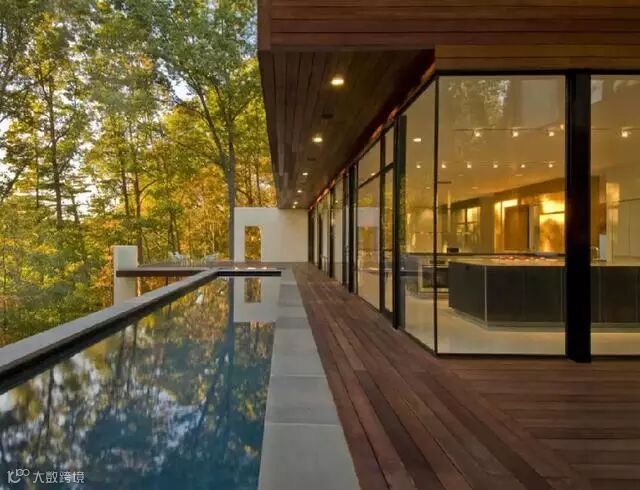 透过广阔的落地窗,那个鼓舞人心、充满着活力的秋天也倒映在泳池里。建筑师Robert Gurney一手打造的这个世外桃源,其设计的独特在于运用了木头去建这座房子的同时,通过落地窗又展现了窗外木的自然形态——它本来是树时候的样子。