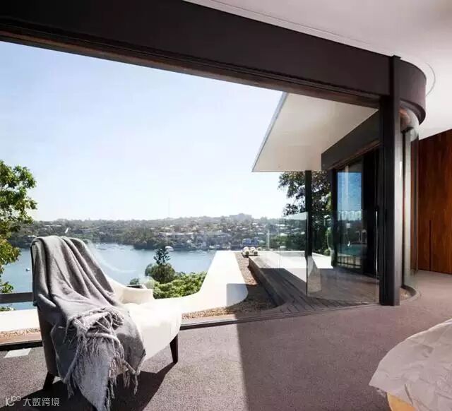 位于澳大利亚巷湾河的这所河上房子有着非常宽的落地窗,从天花板到地板,完全打开了视野,带有转弯角的玻璃墙形状很好的与远处起伏的海岸线形成了共鸣。