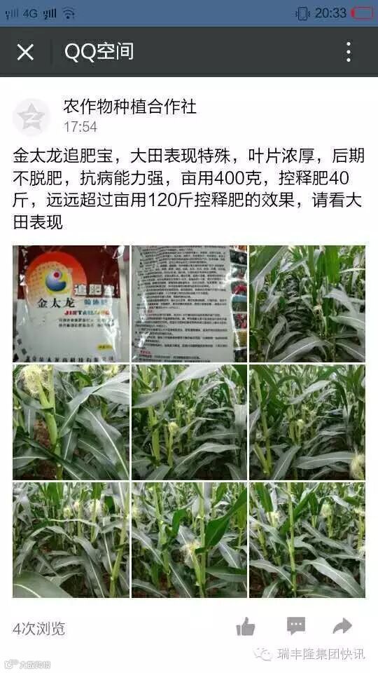 瑞丰隆集团快讯“我种了十几年的地,就数今年用了金太龙的玉米棒子大,长势好,就等着丰收了!”安徽宿州使用过金太龙追肥宝的示范户高兴地告诉许栋军经理。下图就是今年安徽宿州市场部在玉米上推广金太龙追肥宝替代追肥的示范田,可以看出玉米叶子宽,叶子厚,茎干比较粗壮,拔出根系还有许多的小白根。示范田采用从底肥到追肥全部使用金太龙系列的产品,为的就是产品出效果,农民有产量,增产又增收!