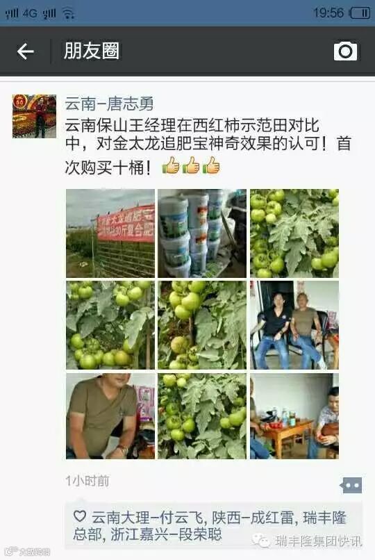 瑞丰隆集团快讯8月23日,在云南保山蔬菜示范基地,一株株番茄长势旺盛,绿油油的枝叶下面挂满了累累果实。旁边种植用户介绍,今年的番茄之所以品质这么优秀,都是金太龙追肥宝的功劳!喷施了金太龙追肥宝后,大大地促进了番茄生长,一个个番茄圆又大,虽然颜色是青绿色的,但绿得似玉,表皮光滑,几乎没有裂果!所以,种植户决定再进十桶金太龙追肥宝用于后期番茄的管理和追肥,以提高产量改善品质便于早一天上市!