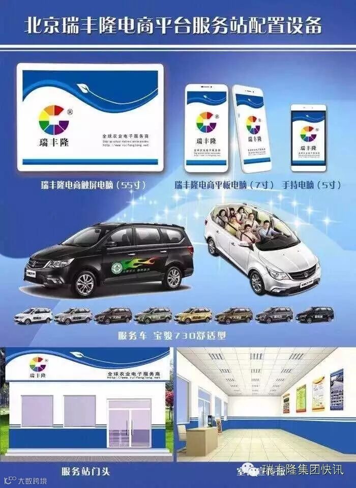 截至今日,瑞丰隆农村电商平平台,已完成PC端,手机端平台搭建,并已顺利上线运行;建成并运营52家县级运营中心,运营中心遍布全国各地。公司为每家运营中心和乡级服务站配备“瑞丰隆”电商专用平板电脑,平板手机以及专用软件一套;配备专用物流配送车辆(宝骏730,福特江铃全顺);配备价值10万元“瑞丰隆”推广农资产品;统一的门头及店内装饰板制作,轻轻松松升级店面。