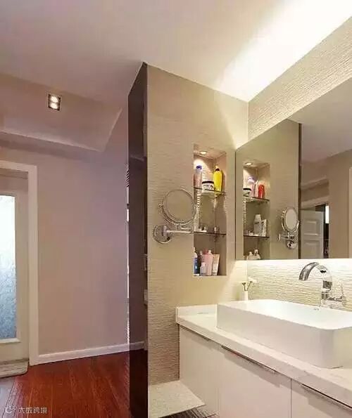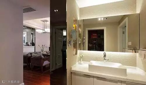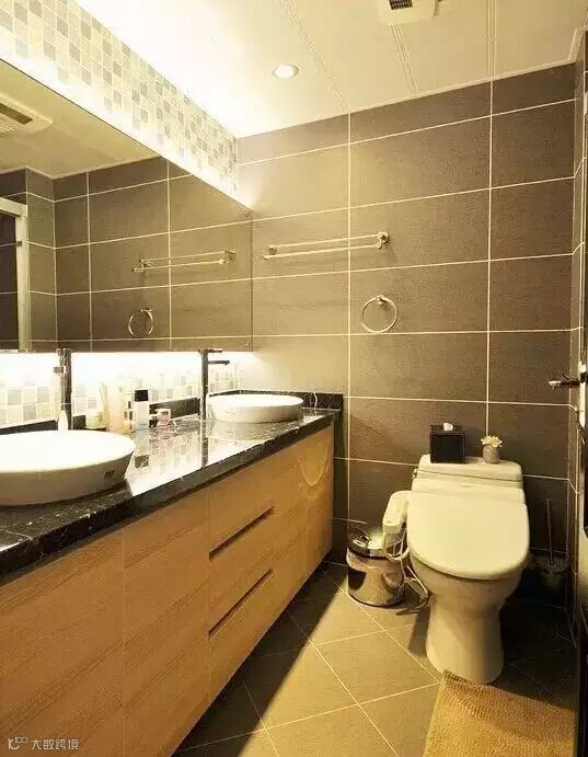 酒店式的装修,整面大大的镜子,现代感的灯带搭配灰色的墙砖,镜子后面是一面马赛克,浴室柜是外面定制的,台面是另外加的大理石台面,整个卫生间干净酷酷的!
