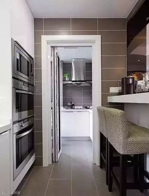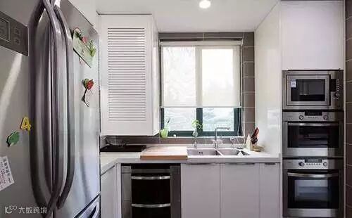这个案例的中厨是北阳台改的,L型台面,就一个脱排和一个水槽,外面的洗菜洗碗,里面的洗锅子,这样烧好一个菜,就不用把重重的锅子端外面来洗了。